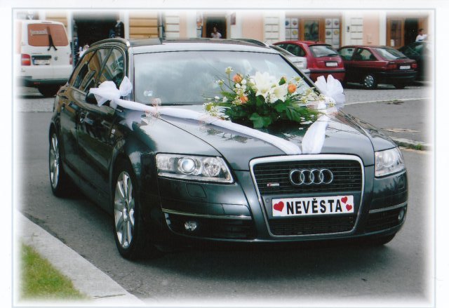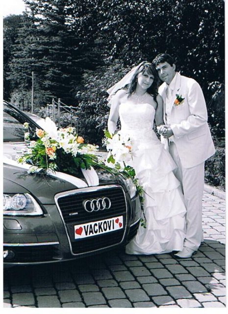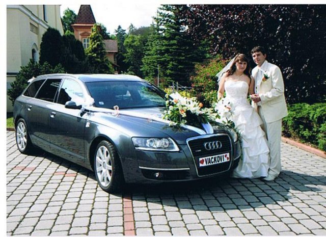 SVATEBNÍ AUTO : nejprve jsem měla jen Superbem, ale nakonec nám byla nabídnuta Audi A6, takže té se prostě nedalo odolat. Měla jsem ji doma půjčenou už od čtvrtka, takže jsem v ní každou chvilku seděla a kochala se tím, jak uvnitř vypadá skoro jako limuzína. Zadní okýnka měla tónovaná skla, takže dojmem limuzíny byl úplně dokonalý. Navíc byla tmavě šedé barvy v provedení kombi, což byla nádhera a šoférovi mé svatby se s ní potom hodně těžko loučilo :-) Ozdobila jsem si jí sama a všichni si na svatbě jako první chválili, jak nádherně máme ozdobené auto a že to jednou budou chtít taky tak, prostě to už ani nepotřebuje komentář, podívejte se na její fotky.