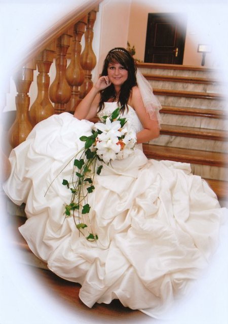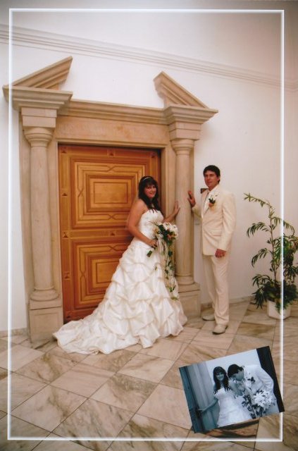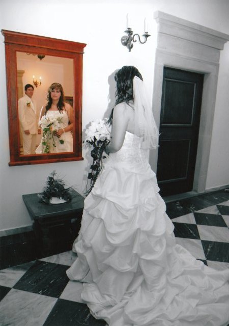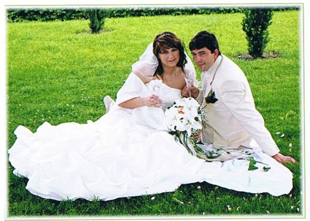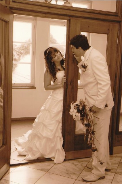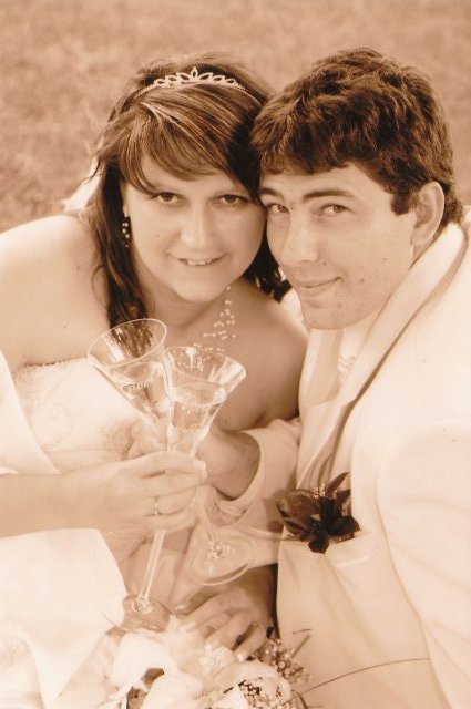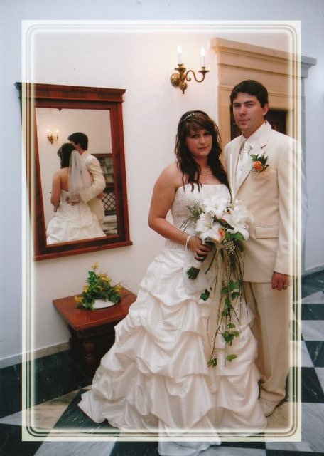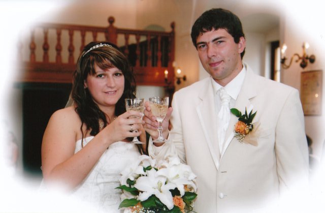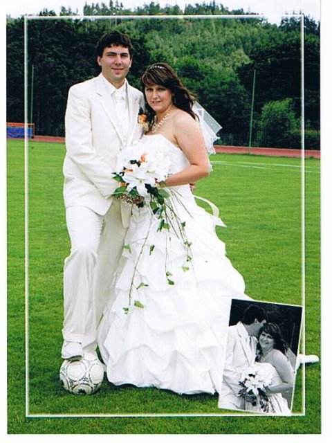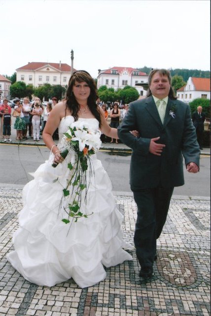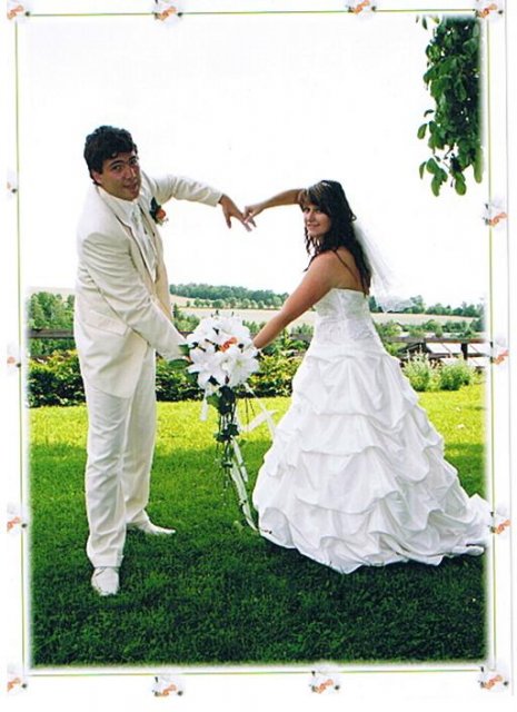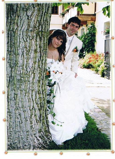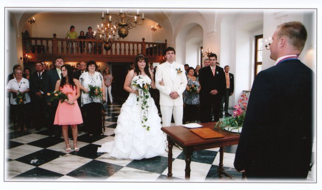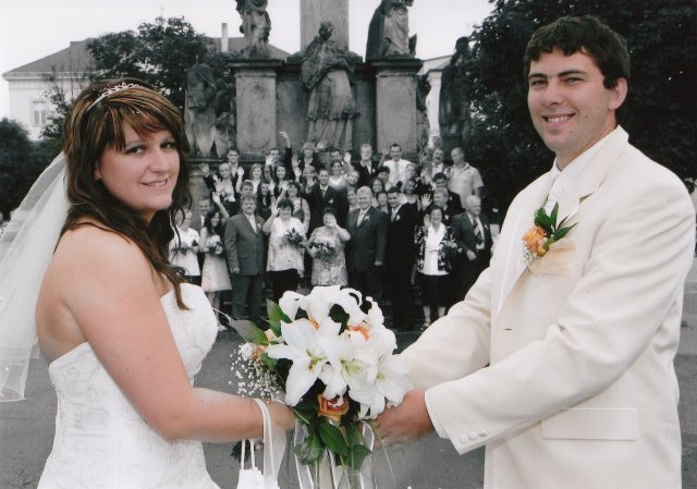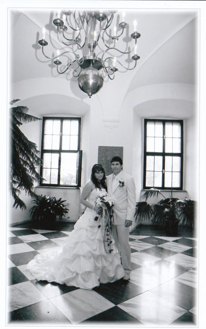 SVATEBNÍ ŠATY : Protože na svatebních šatech mi záleželo asi ze všeho nejvíc, začala jsem s jejich výběrem raději už v září roku 2008, aby jsem měla opravdu ty moje vysněné. Nejprve jsem si zamluvila šaty v plzeňském salonu Nathalia na náměstí. Když jsem se v nich později viděla na fotkách, připadala jsem si jako těhulka a navíc jsem je měla už trošku nad zemí a to jsem neměla zatím ani boty. Proto jsem je později došla zrušit a šla jsem se podívat do svatební půjčovny Ornela také v Plzni. Nejprve jsem si myslela, že champange šaty si na sebe nikdy nevezmu, ale když jsem viděla ty krásné princeznovské šaty v půjčovně neváhala jsem ani vteřinku a okamžitě jsem si je zamluvilam a už se nemohla dočkat, až si je v červnu vyzvednu. Když si dnes na ně vzpomenu, chce se mi znovu brečet, jak byly nádherné.