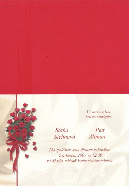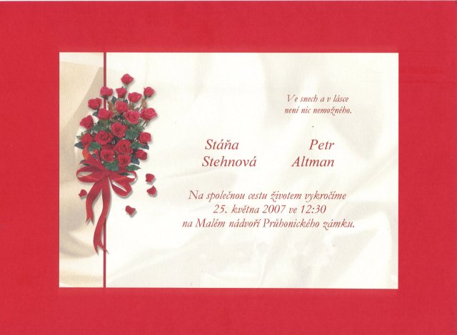 Nejvíce obrázků tu mám zatím jen jako inspiraci. Ale pomalu začnu přidávat zařízené a zakoupené věci,... 15.9.2006 jsem byla požádána o ruku. 13.11.2006 telefonicky zamluvený termín na matrice - 25.5.2007, zámek Průhonice. 22.11.2006 osobně zamluven…