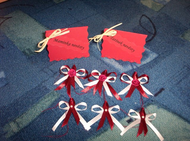 6. 2. 2010 - už máme snubáky. Ale nepodařilo se mi je vyfotit:-( Vytvořila jsem jmenovku pro ženicha a nevěstu a dekoraci na ženichovo auto.......