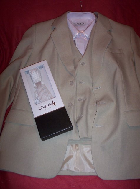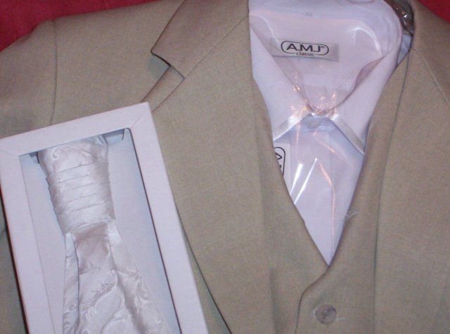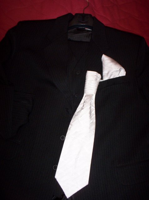 Koupili jsme oblek, košili a kravatu pro ženicha (Břeclav). Máme tmavou a světlou variantu.