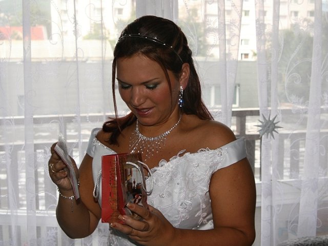 Začalo to kadeřnictvím a líčením v sedm hodin ráno,po celou dobu co jsem seděla u kadeřníka lilo jako z konve,když jsem byla připravená přijel pro mě svědek ženicha, který se ukázal jako opravdový profesionál.