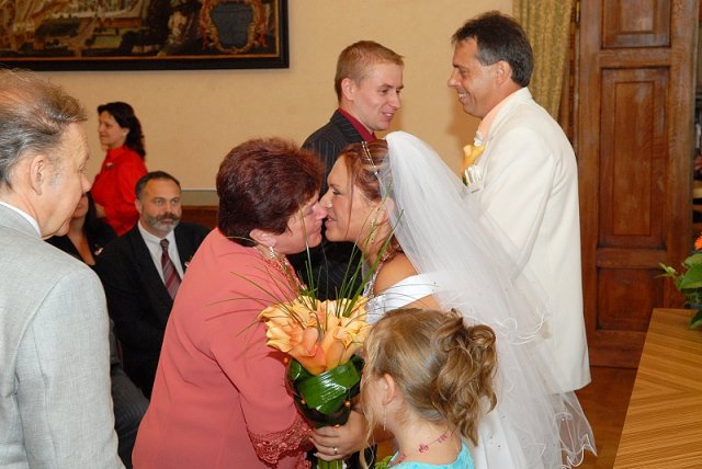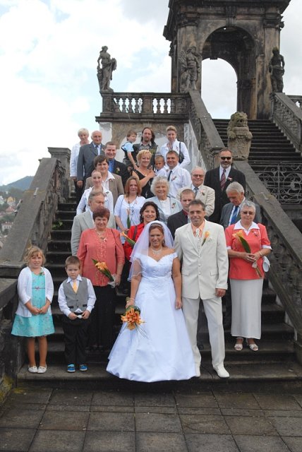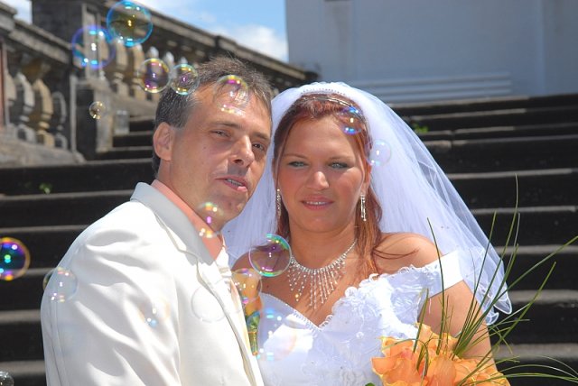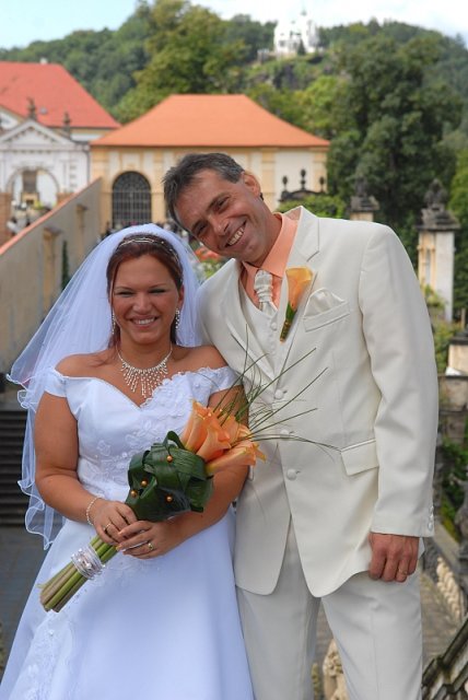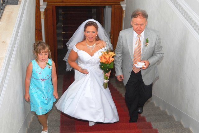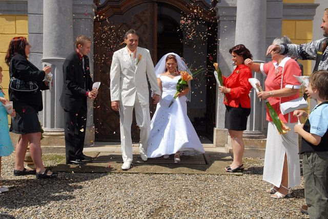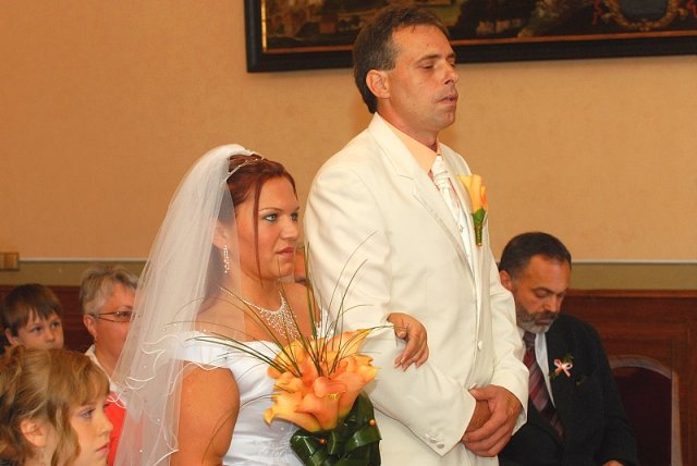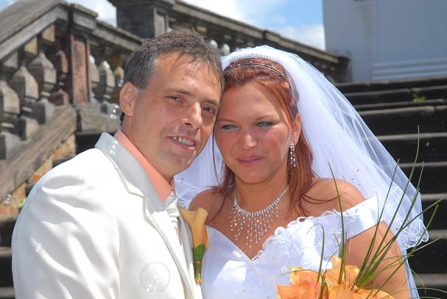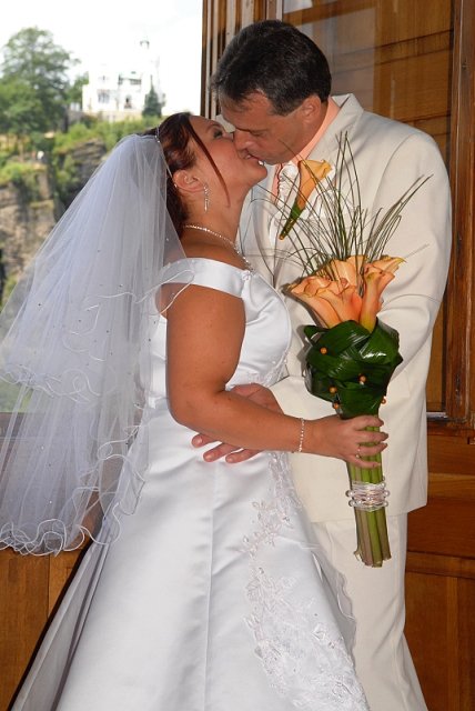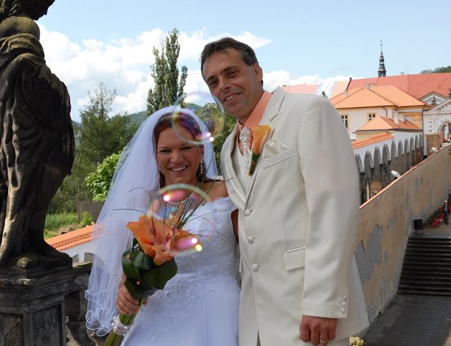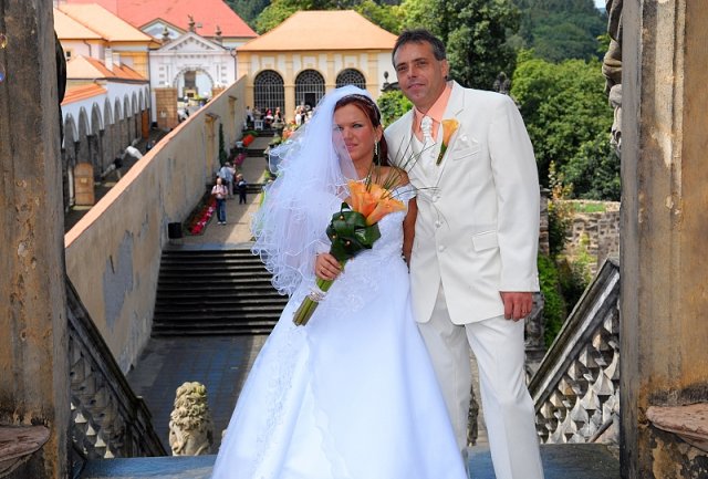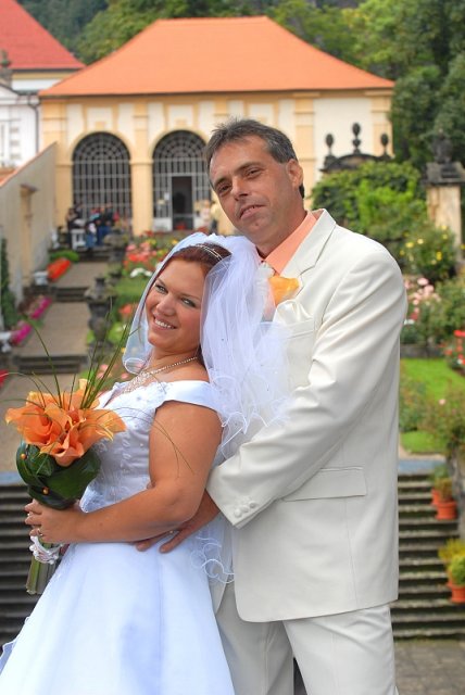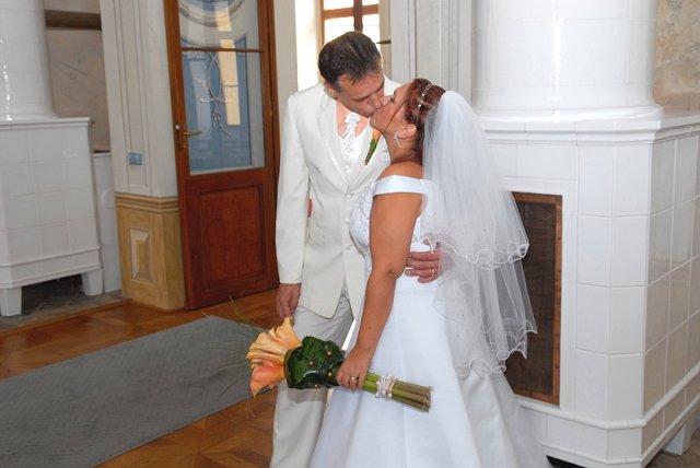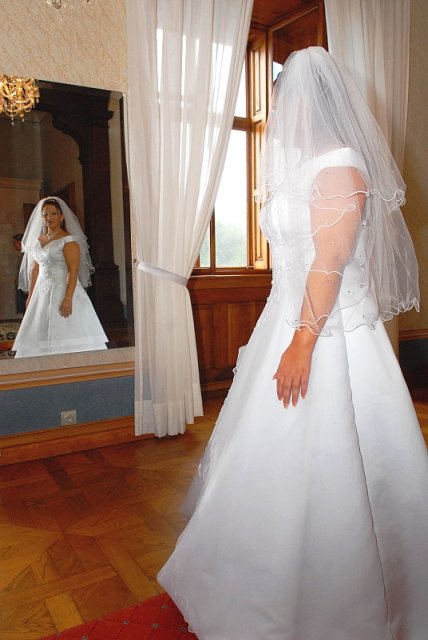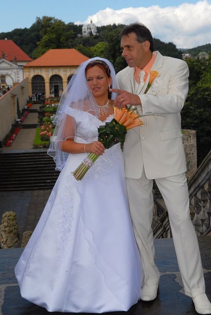 Šla jsem se připravit, obléknout a pak už to šlo strašně rychle - ženich předal kytici já mu připnula korsáž na klopu a jelo se na zámek to už naštěstí nepršelo.