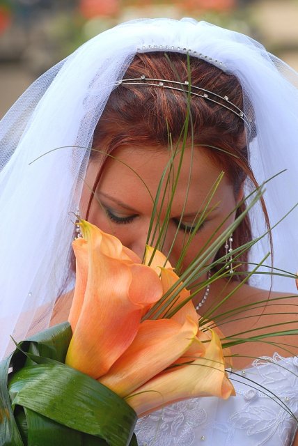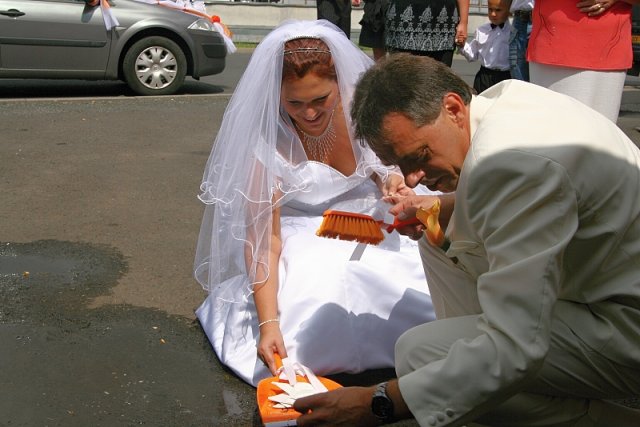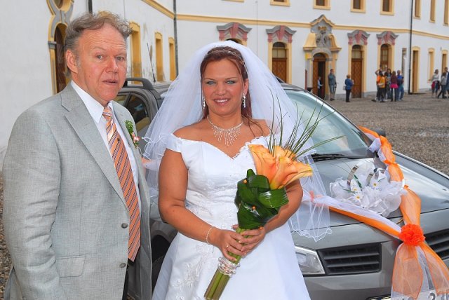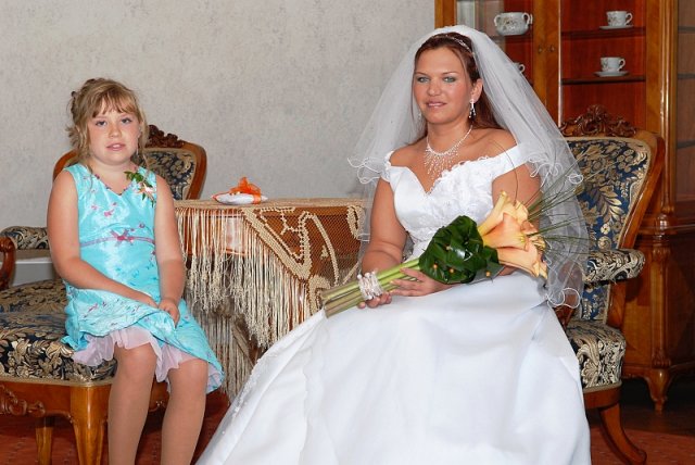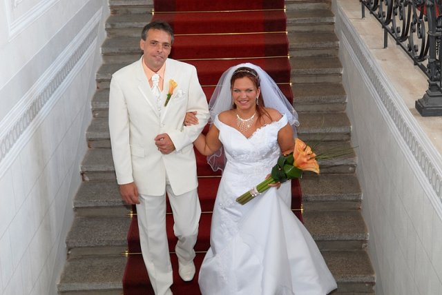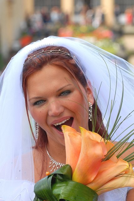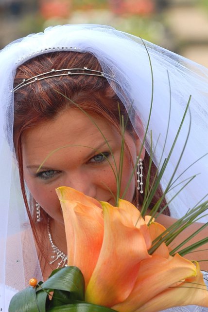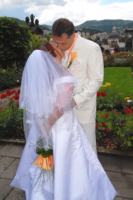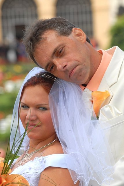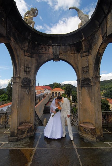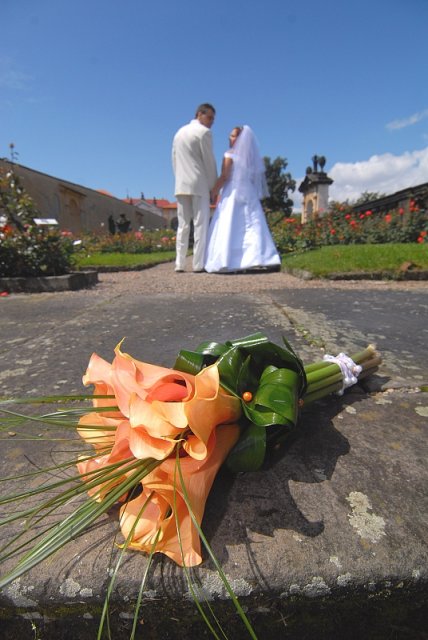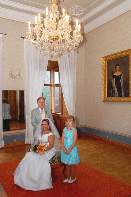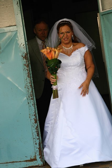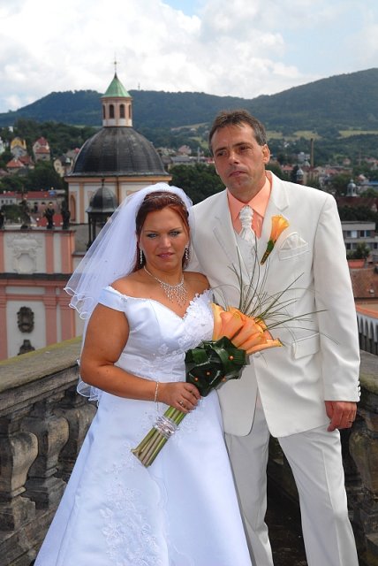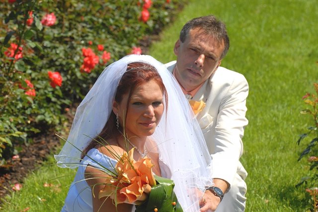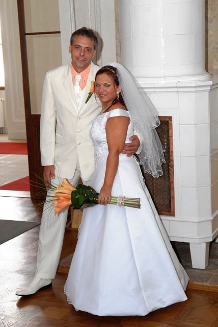 Šla jsem se připravit, obléknout a pak už to šlo strašně rychle - ženich předal kytici já mu připnula korsáž na klopu a jelo se na zámek to už naštěstí nepršelo.