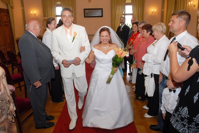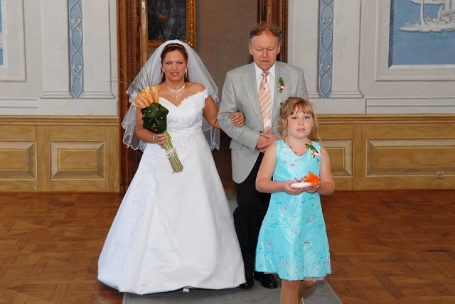 S tatínkem a s družičkou (to že tam budu mít malou slečnu jsem se dozvěděla týden před svatbou tak už se nestihli půjčit šatičky, ale to nevadí byla úplně úžasná a myslím že si to užila a nesla nám prstýnky ) jsem šla do přípravny nevěsty kde bylo malé focení, mezi tím se v obřadní síni připravovali svatebčané a ženich. Otevřeli se dvoje dveře, začala hrát hudba a my jsme vykročili bylo to nádherný a nepopsatelný. Po dobu obřadu opět lilo. pak přišlo to krásné ANO a šlo se fotit když jsme vycházeli ven tak svítilo sluníčko prostě počasí si s námi hrálo, když jsme se fotili v Růžové zahradě opět začalo pršet to už pak svatebčané odjeli na místo hostiny a my si ještě počkali než přestalo pršet pak si užívali focení ještě bylo pár fotek v ateliéru a pak už jsme frčeli za ostatními bylo to tak naplánovaný aby to tam stačili připravit. Když jsme přijeli rozbili nám talíř my ho zametli prosříhali jsme se srdíčkem a dozvěděli se že nám zkysla polévka a že se už vaří nová tak jsme chvilku čekali tím se to vše protáhlo ale zvládlo se to.Tatínek pronesl proslov následoval přípitek a pak už to frčelo jak mělo zábava byla až do půl čtvrté ráno kdy jsme odcházeli jako poslední my "Manželé Havelkovi"