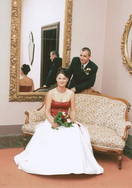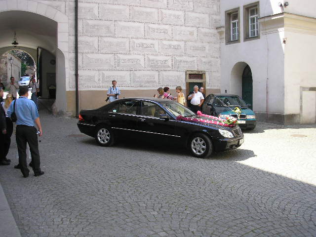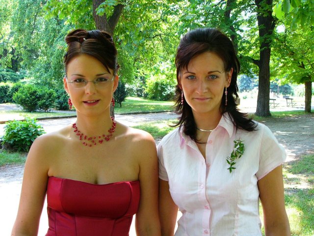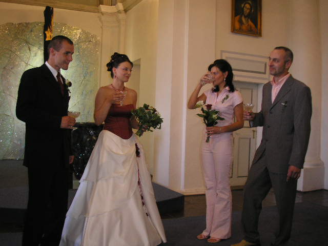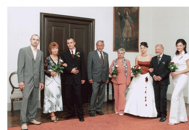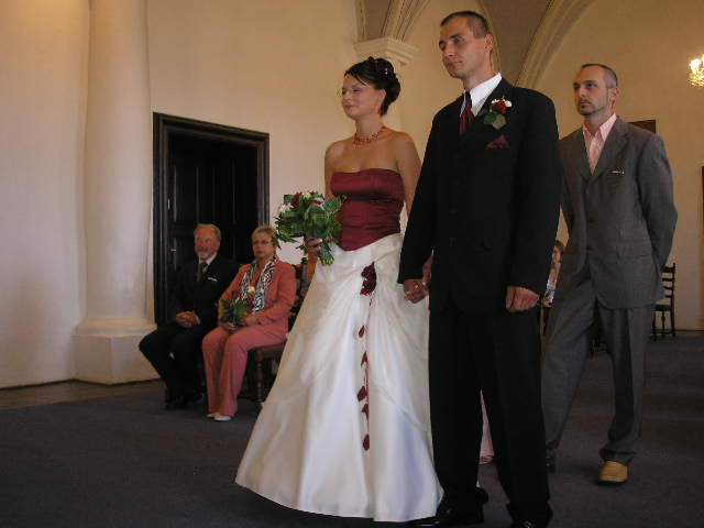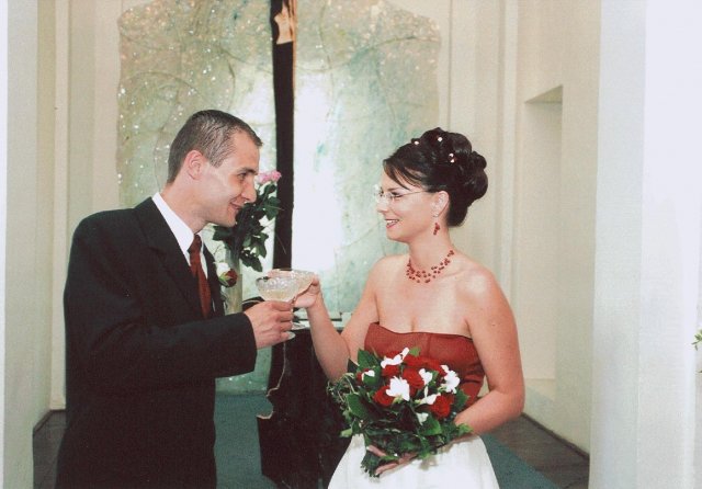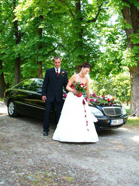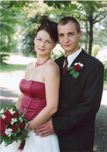 Náš den byl naprosto úžasný!!!!!Vše probíhalo podle plánu, nic jsme nezapomněli...Počasí bylo nádherné, sice trošku vedýrko, ale já to ani nevnímala.Vše se tak rychle seběhlo, jako kdyby to ani nebylo o nás:-)Nervózní jsem nebyla, až do doby, kdy jsem seděla u kadeřnice a čas ubíhal a účes stále nebyl hotový, ale nakonec jsme to zvládly v pohodě.Další problém byl s výzdobou auta, jak jsem pak vyposlechla odpoledne, to byl snad největší problém z celé svatby:-)Děkuji Vlaďce,Zdence,Kájině,Péťě a samozřejmě dalším, co spolupracovali, protože výsledek byl ohromující.Když už jsem u auta, moc děkuji kamarádovi - svědkovi od Petra, Michalovi, který si vypůjčil tak nádherné žihadlo a ještě mi dělal řidiče.Dále děkujeme Milanovi, který propůjčil hudební aparaturu, Hanzlům za video a fotografie,Janče také za fotografie, Jardovi za zorganizování rautu.A samozřejmě všem ostatním,kteří byli s námi v náš den.