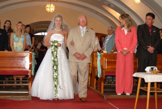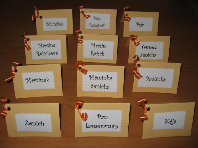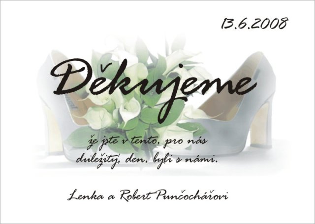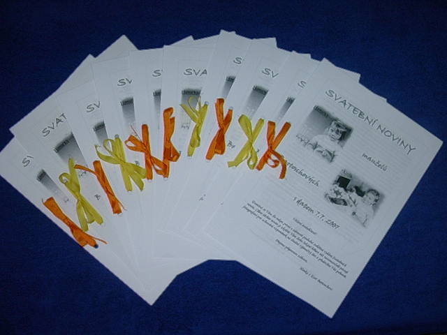 Po vice jak dvou měsících se znovu vracím k našemu albu. Uz mame na matrice objednan termin "naseho velkeho dne". Rozhodli jsme se pro 6.6.2008 a tak musime zacit s planovanim. O vikendu jsme byli na Svatebnim veletrhu a objednali si tam ty nejkrasnejsi prstynky. Mam z nich velkou radost a uz se moc tesim, az je budeme nosit. Pres vikend jsme taky objeli par restauraci a udelali rezervaci te podle nas zatim nejlepsi restaurace.________________________________Už ani na 2 měsíce a bude náš velký den :-)____________________________________Už máme téměř vše připravené. Většina svatebních hostů je už pozvána na oslavu. Máme oblečení, matriku, zámek, oznámení, pozvánky ke stolu, já už mám kadeřnici, kosmetičku atd. Už je to téměř vše. Ještě musíme doladit cukroví a dorty a pád drobností.