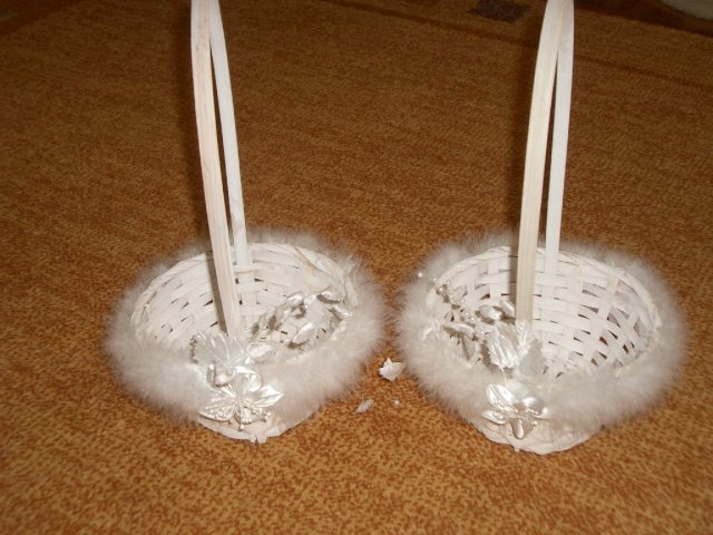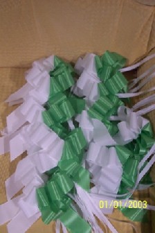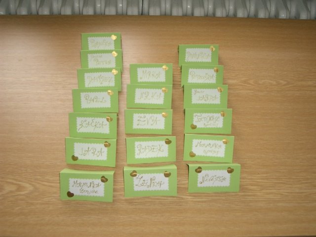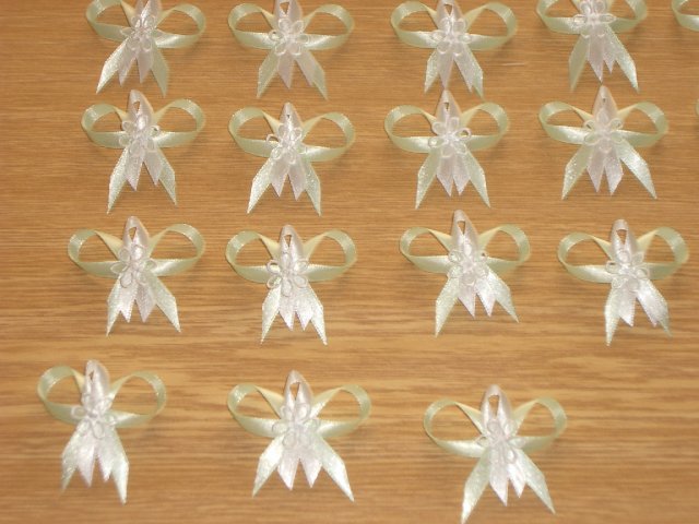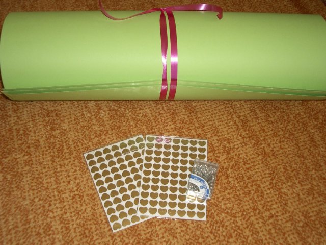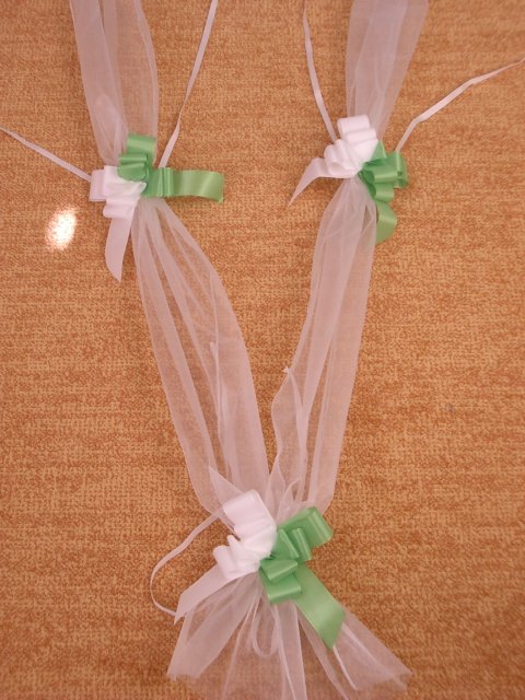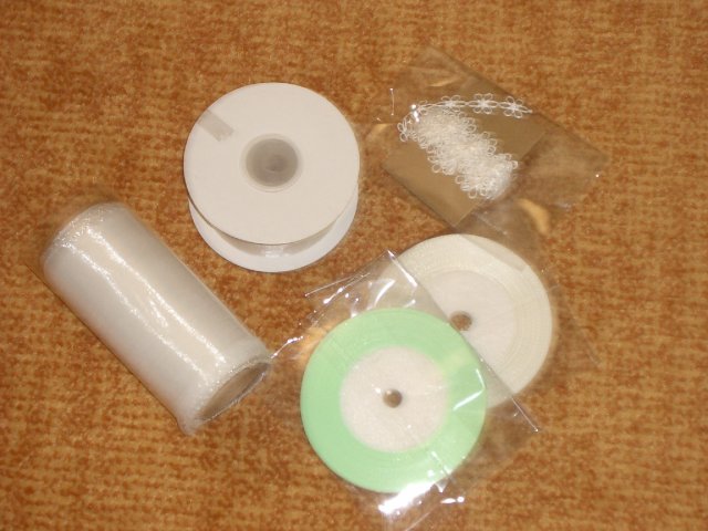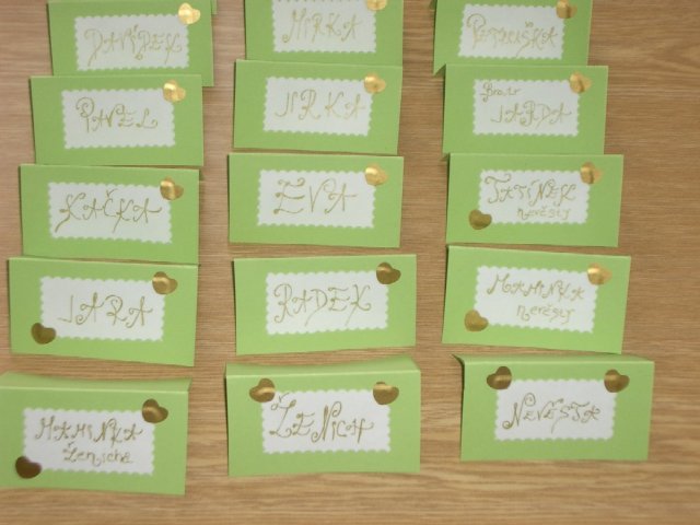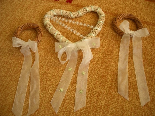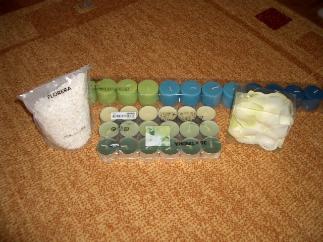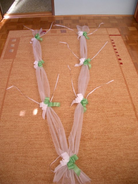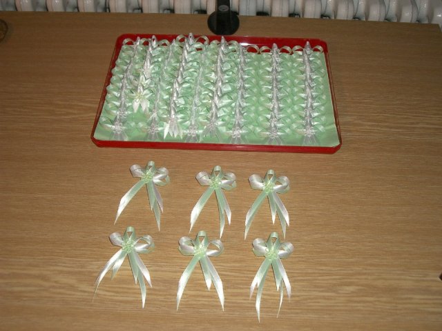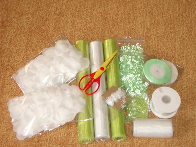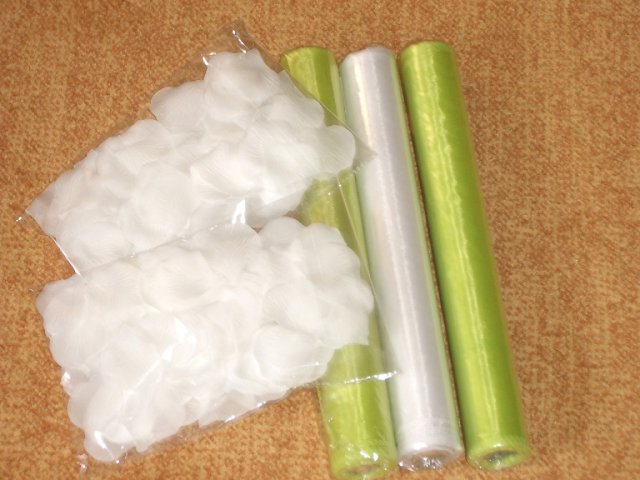 Co už všechno máme......:-).Organzu, kapičky rosy, mašličky, okvětní plátky růží, dekorační nůžky, zelený papír na jmenovky + zlaté srdíčka, košíčky pro družičky, bílý písek, svíčky, mísu na květinovou výzdobu, podtácky pod prstýnky, vývazky pro svatební hosty, mašle na výzdobu auta, nevěsta botičky, jmenovky na svatební tabuli, nevěsta bižuterii na krk + naušnice.