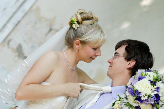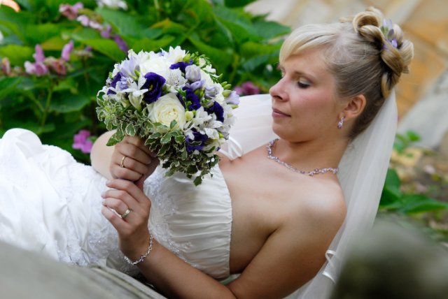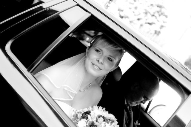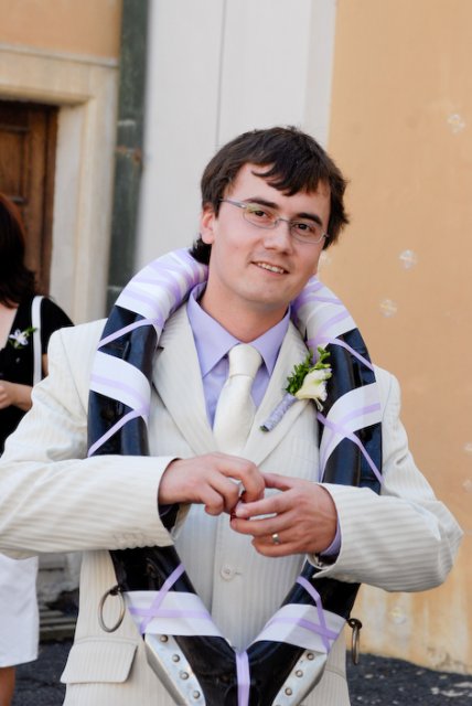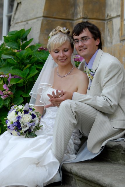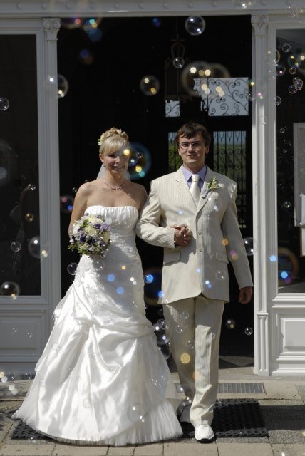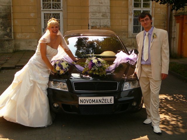V půl 11 jsem se začala oblékat. No byl to tedy opravdu zážitek, protože jsem si musela navléct do šatů spodem, takže mi muselo pomáhat docela dost lidí, ale úspěšně jsme to zvládli. :-) V 11 hodin, jsme začali všechny svatebčany vyhánět z domova a mělo se vyrazit. Ženich na mě čekal také venku, aby mi mohl předat kytičku. Pak už se vyrazilo směr Duchcov.