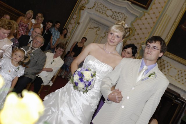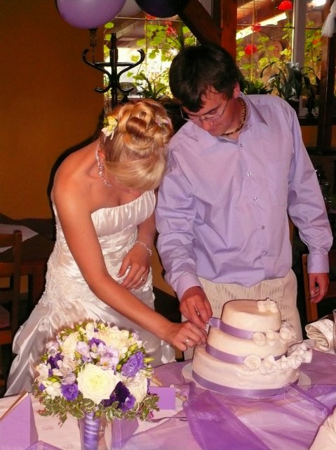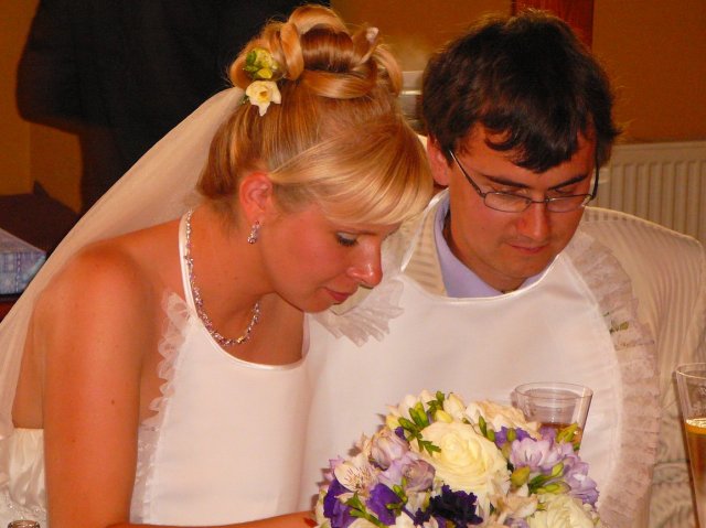 Po příjezdu do Chlumce a jejich přivítání se mohlo začít obědvat. Jídlo bylo skvělé a celá restaurace byla nádherně nazdobená. Personál restaurce byl moc ochotný a velice šikovný. Po obědě jsme nechali svatebčany trochu odpočinout a po delší pauze mohl začít novomanželský tanec. Bohužel to nedopadlo, tak jak jsem chtěla, protože ženichovi se walz opravdu tančit s mojema šatama nechtěl, tak jsme zatančili normální tanec. Pak už začalo dovádění, náš DJ byl skvělý a hrál nádherné písničky. Do večerní zábavy vložil i 2 hry, poznávání ženicha a nevěsty. Ženich mě měl poznat podle kolena, ale bohužel nepoznal a já ženicha podle pánského pozadí. To byl pro mě dost velký šok, protože když jsem sáhla na první pozadí, zjistila jsem, že všichni mají pozadí náhé nebo mají spodní prádlo natažené jako tanga. Všichni se z toho děsně bavili a já byla červená snad až taky na pozadí :-))) No ale ženicha jsem poznala, asi ale jen pomocí vylučovací metody. :-) Byla ta moje poslední možnost sáhnout na cizí pozadí :-) Pak už se jen tančilo a pilo.