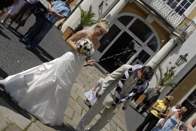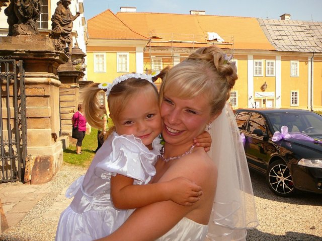 Na zámek jsme přijeli o trochu dříve než jsme předpokládali, ale alespoň všichni měli čas dojít a já i ženich jsme měli alespoň chvíli času, se s většinou lidí pozdravit. V 11:45 pro nás přišla již paní ze zámku, řekla nám potřebné informace a rovnou před branami zámku si nás seřadila. Řekla bych, že to bylo ještě zbytečné, ale budiš. Před vstupem do Valdštejnského sálu, jsme s ženichem šli ještě bokem, podepsat potřebné dokumenty a obřad mohl začít. Tady nastala snad první věc, která se nepovedla. Přímo paní ze zámku, jsem řekla, že bych chtěla na nástup píseň Motiiv panny, která se mi moc líbí, ale pan klavírník mi zahrál klasický pochod a mou píseň mi zahrál v průběhu obřadu asi jen 30 vteřin, ale jinak obřad byl skvělý. Sice nám tam před obřadem upadla svědkyně ženicha, ale během obřadu se jí tam dala židle a už to bylo lepší. Obřad byl moc krásný, ale neskutečně rychle utekl. Po obřadu to z nás už všechno spadlo :-), ženich dostal po východu ze zámku chomout a kouli, který byl moc pěkný a já dostala byč. :-) Pak už následovalo focení, bohužel další zádrhel v zámku, protože než se ženich vykoupil z koule, tak zámek paní zamkly a když jsme chtěli dělat hromadnou fotečku jako srdíčko a chtěli jsme, aby naší fotografku pustili tak na 2 minutky do patra, aby nás vyfotila, tak už prý bylo zamčeno a nikoho tam nepustí. A přitom na nás všichni za oknem koukali. No ochota sama. Po pár společných fotkách, při kterých se snad všichni dobře bavili, jsme se už šli fotit jen my. Bylo to naprosto skvělý, moc mě to bavilo, ženicha sice moc ne, ale byl celý den skvělý a věděl, že to musí vydržet. Před druhou hodinu jsme vyrazili na hostinu. Moje původní představa byla, jet co nejdkratší cestou do Chlumce, ale kamarád řidič a manžel mojí svědkyně si to nějak rozmyslel a projel celé Teplice :-)