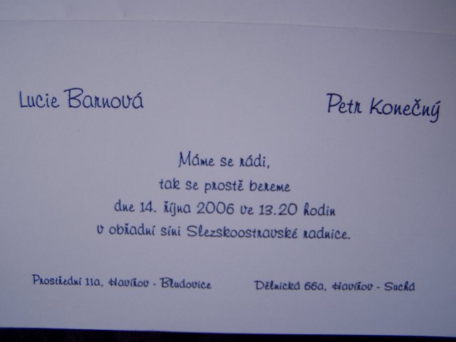 Svatbu budeme mít 14.10.2006 ve 13:20 na Slezskoostravské radnici v Ostravě.