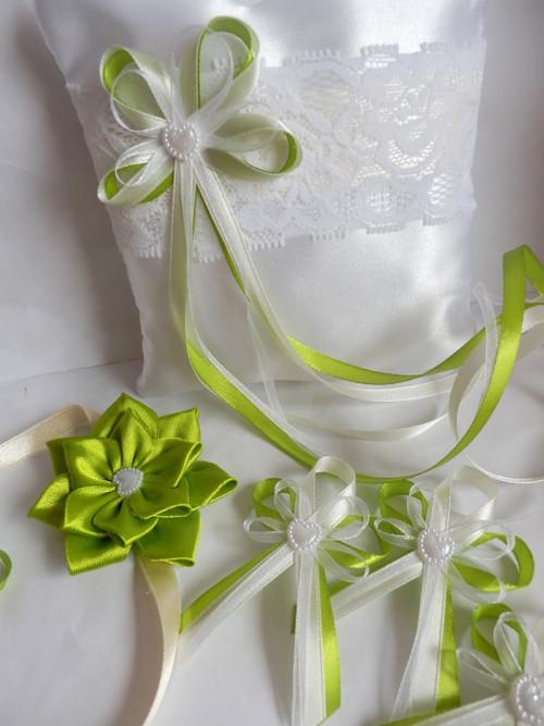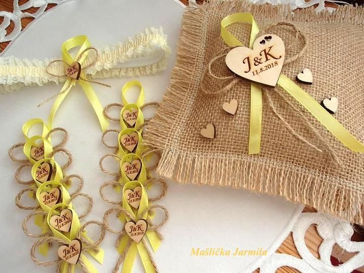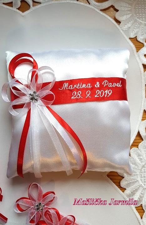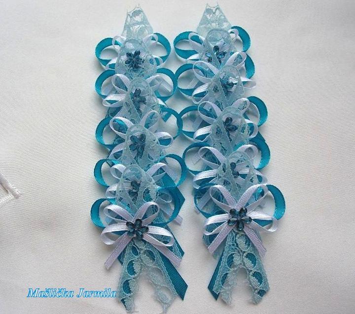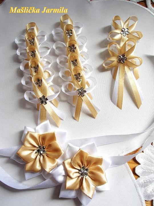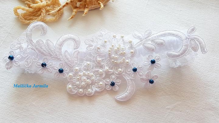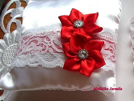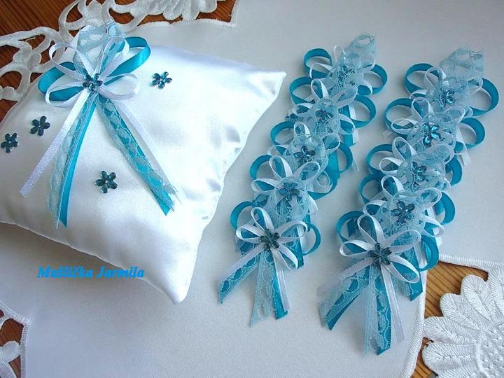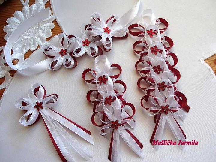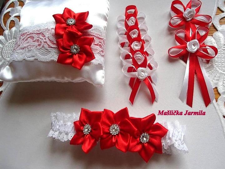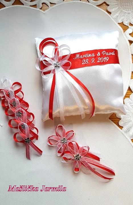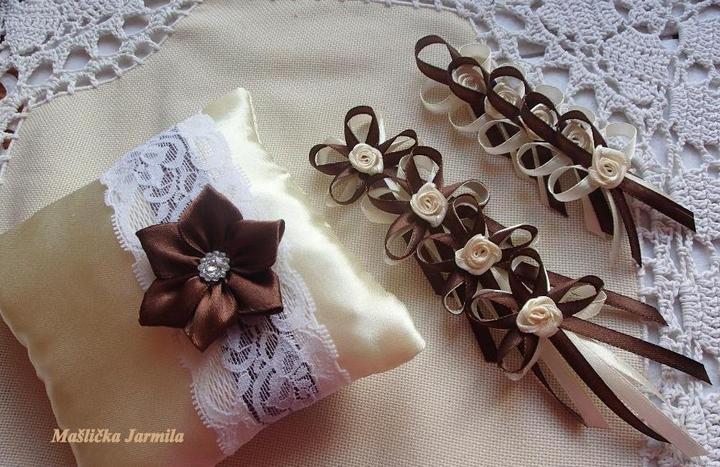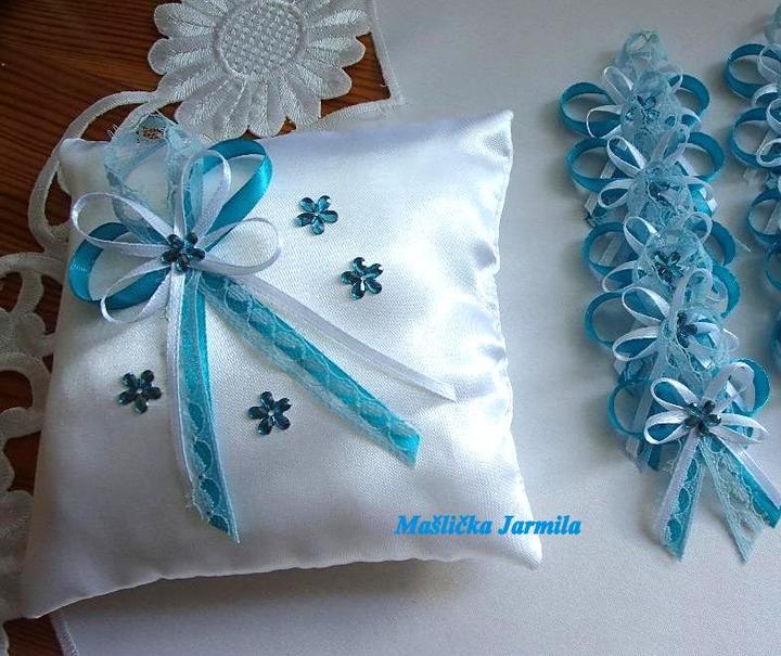 Šiji svatební vývazky malé pro svatebčany, velké pro rodiče a svědky, svatební polštářky, náramky a ozdoby do vlasů pro holčičky, svatební podvazky tradičních i velmi netradiční.