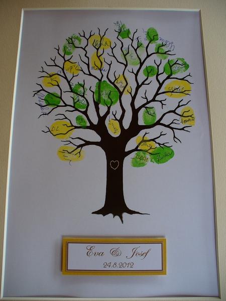 my měli vytištěný A3 strom z googlu, čtyři barvy razítek (podzimní) a pak jsme k tomu ještě udělali lístečky z papíru, na které nám hosté psali vzkazy a věšeli to na šňůru, máme z toho moc krásných vzpomínek.... strom máme zarámovaný (normální rámeček z ikei), pověšený doma na zdi a moc se všem líbí... na barvy stačily normální vlhčené ubrousky, nikdo si nestěžoval, že by byl upatlaný nebo tak něco (a jako když se cpali zákuskama a vším dalším možným, byli upatlaní asi víc... :D :D)