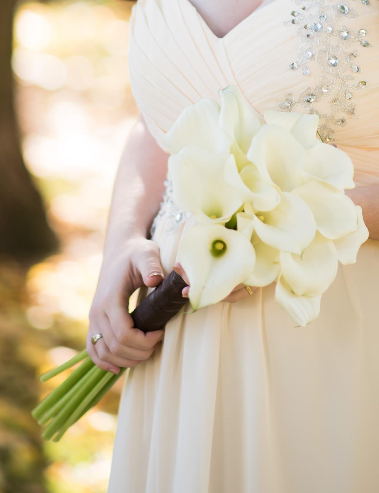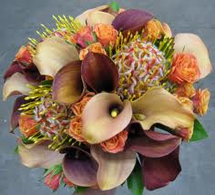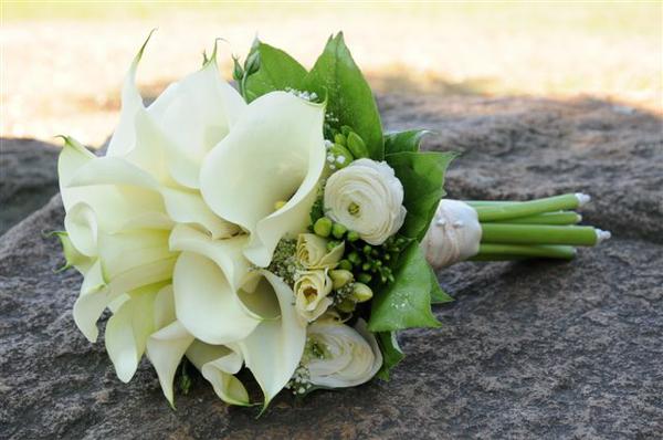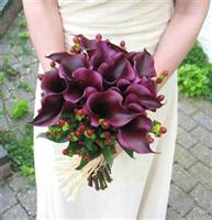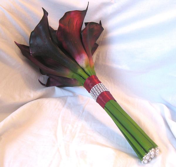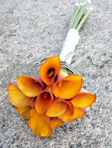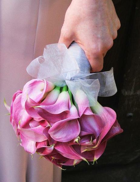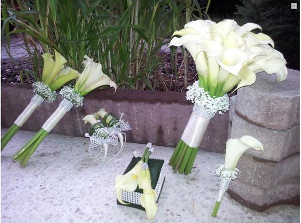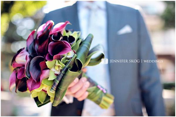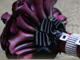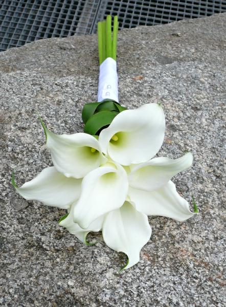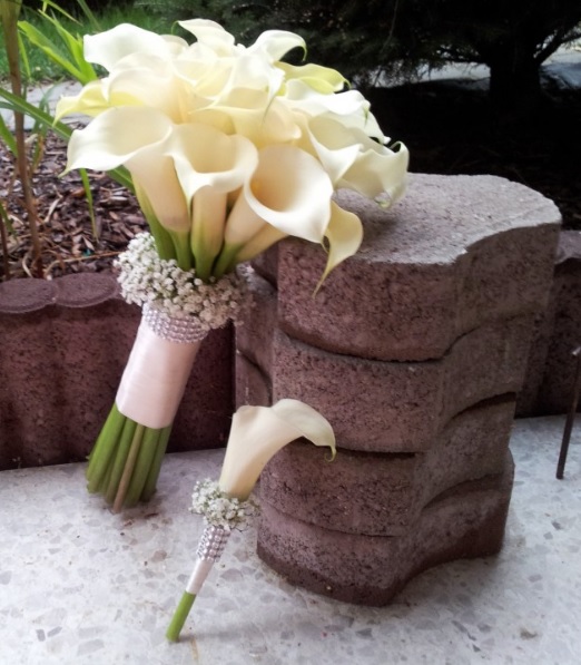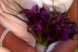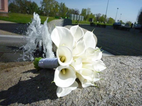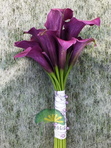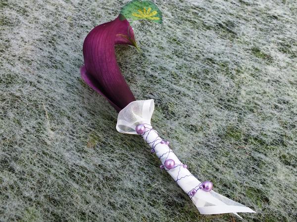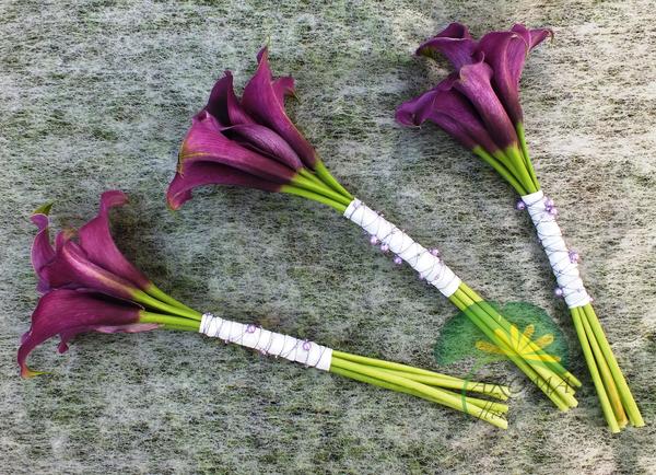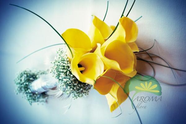 Žluté kaly pro svatbu v lednu a fialové pro svatbu v září (korsáž pro ženicha, svatební květina, květiny pro maminky a svědkyni)