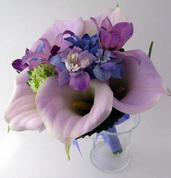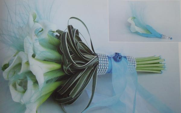 Modré kaly by musely být jedině barvené a přiznám se, že jsem se s nimi v květinových velkoobchodech ještě nesetkaka. Pokud byste ráda ladila květinu do modré barvy volila bych přirozeně modré květiny - irisy, modřence, delphinium, hortenzie, či bílé kaly ozdobila modrou stuhou či modrými peříčky.