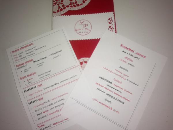 Úplně jednoduše jsme ve Wordu napsali menu písmem jako jmenovky a text svatebního oznámení, vytiskli, smotali do roličky a převázali mašlí v barvě svatby ;-)