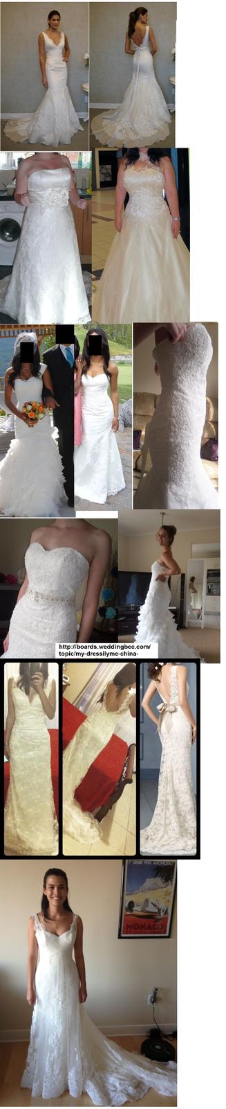 @clare_x Ahoj. Posílám fotky reálných šatů, které jsem měla uložené. Jsou z fora weddingbee.com, jestli umíš anglicky, tak tam zadej do vyhledávače ebay nebo alliexpress a vyjednou tam na tebe kontrétní zkušenosti, ceny a fotky předloh podle, kterých se šilo. Většina nevěst si neobjednává vystavené šaty na stránkách, ale pošle vlastní předlohu šatů, které se jí líbí + nějaké požadavky na změny, požadavky na materiály, ozdoby ...Je to složitější na komunikaci, ale když se zadaří, tak to často stojí za to, no a někdy třeba ne :). Bwt. jestli mě zas někdo bude nenápadně obviňovat z toho, že s tím kšeftuji, tak ať si poslouží, ale pravda je taková, že jsem objednávala troje šaty pro mé kamarádky, nic víc, nic míň...