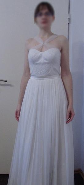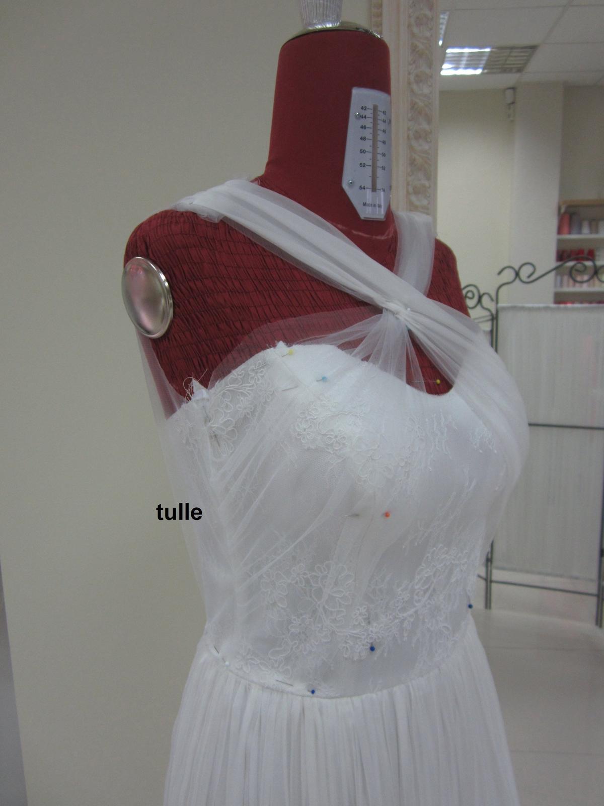 @teristraki - včera už mi přišly první fotky rozpracovaných šatů! Prodejkyně mi krásně nafotila rozdíl mezi ramínky z tylu a z hedvábného šifonu - vybírám dvě fota (vytvořím pak album, kde budou všechny fotky včetně mých inspirací). Do finální podoby ještě hodně chybí, ale stejně na ně pořád zálibně koukám :-)