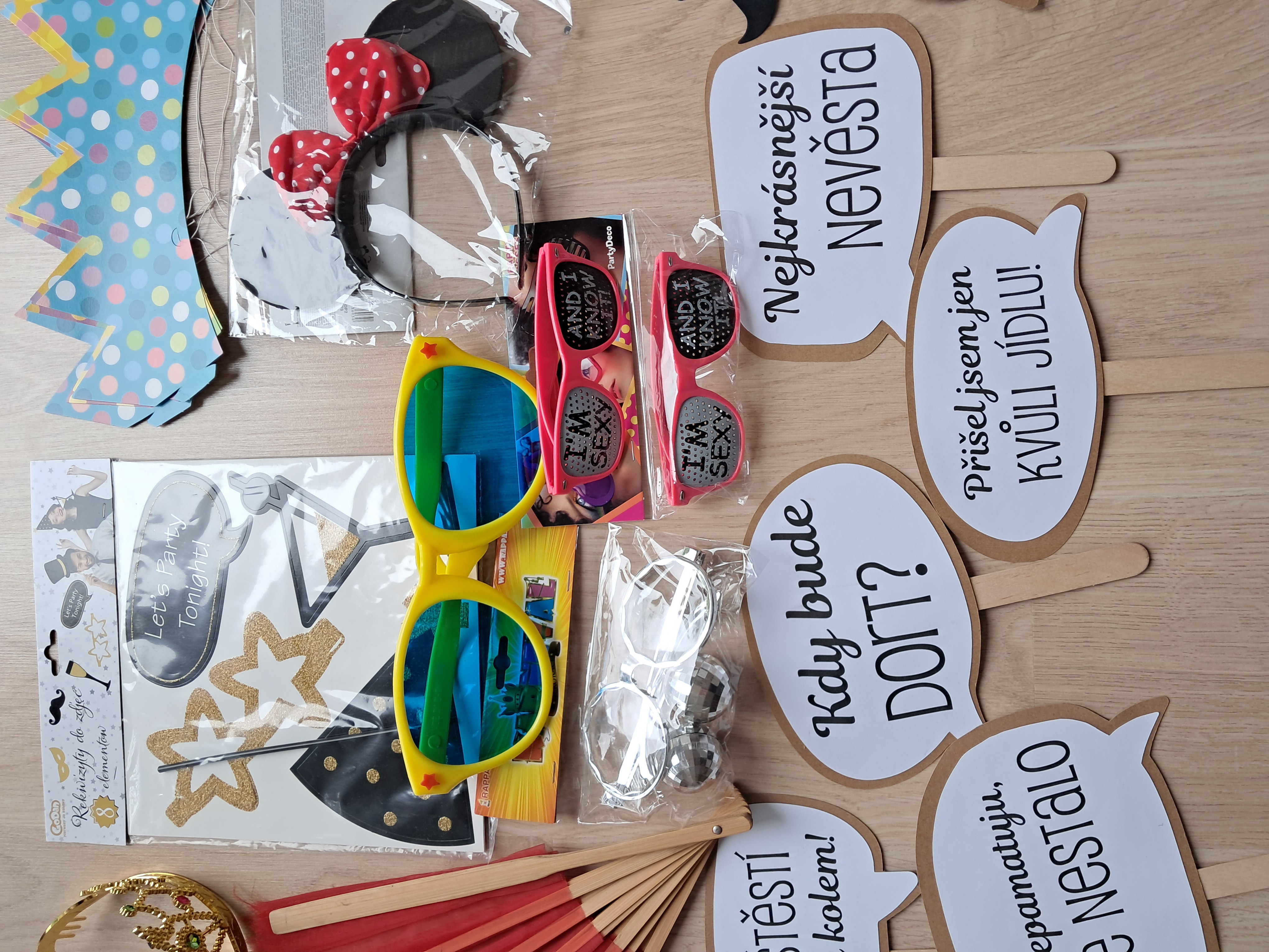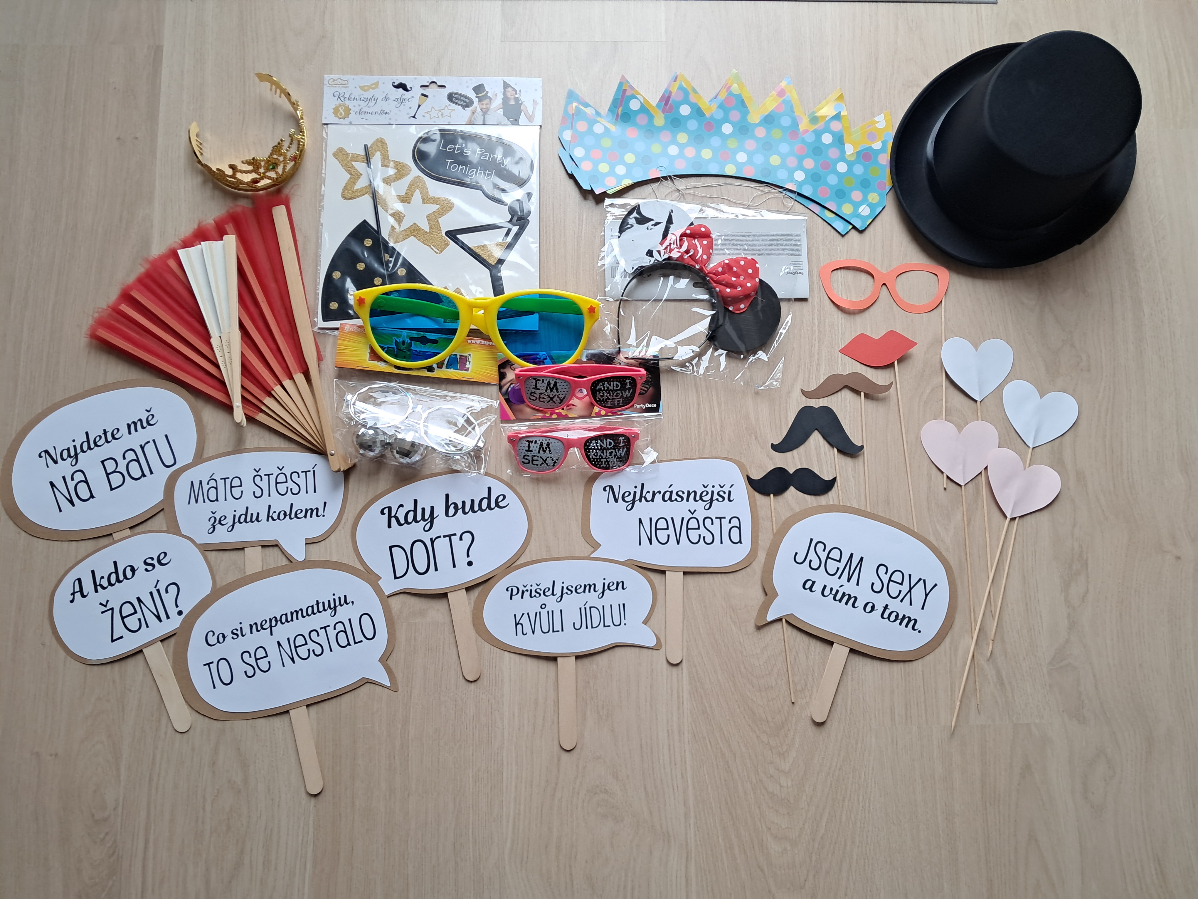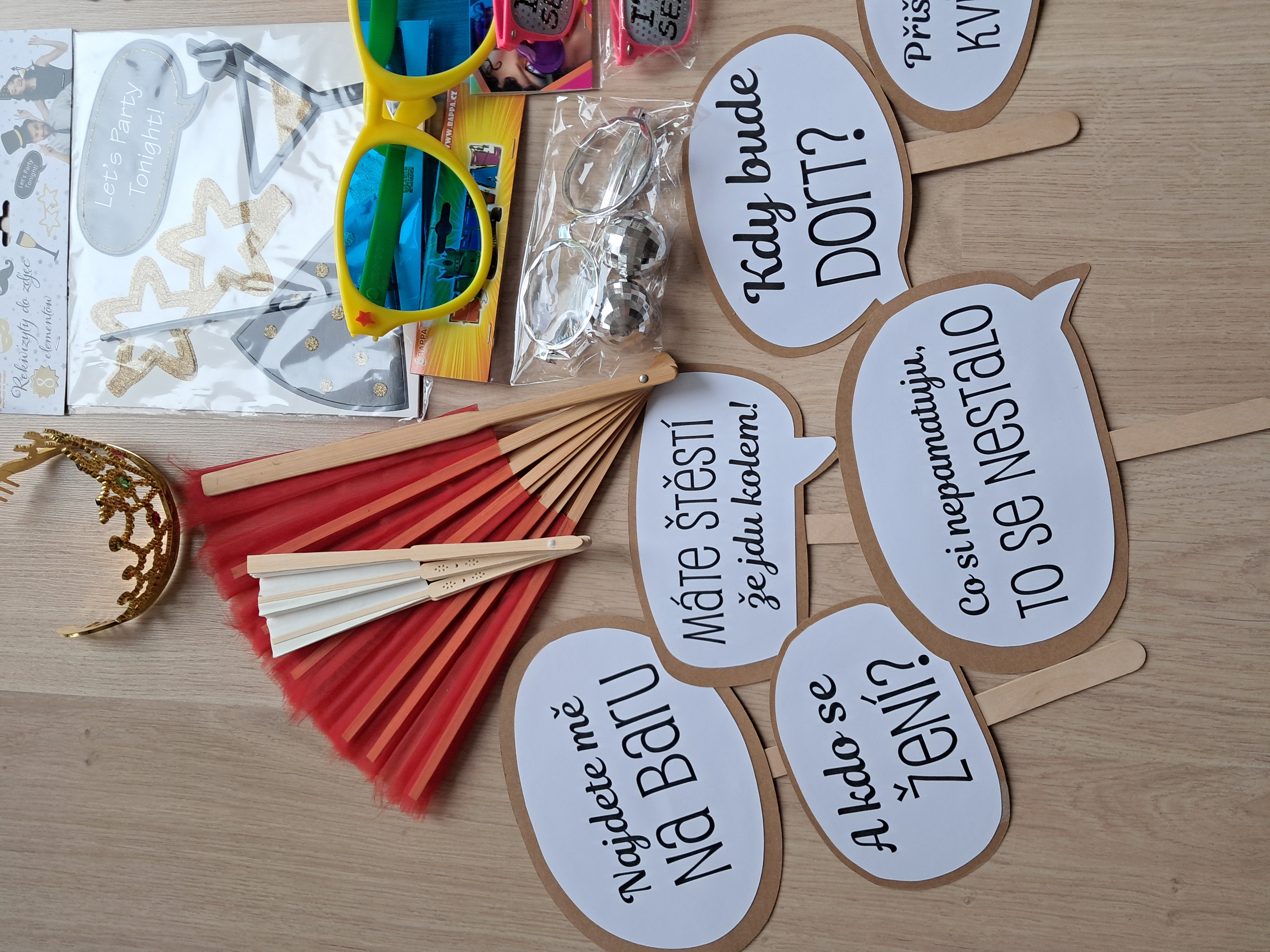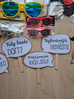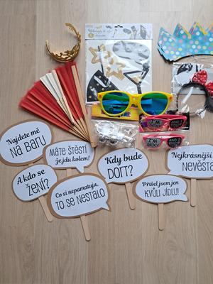 Nabízím použité rekvizity do svatebního fotokoutku. Papírové nápisy a doplňky, papírové korunky, klobouk, vějíře, plastové brýle.... něco i nové. Nejlépe předání v Praze. Ale není problém zaslat Balíkovna, PPL nebo Zásilkovna.