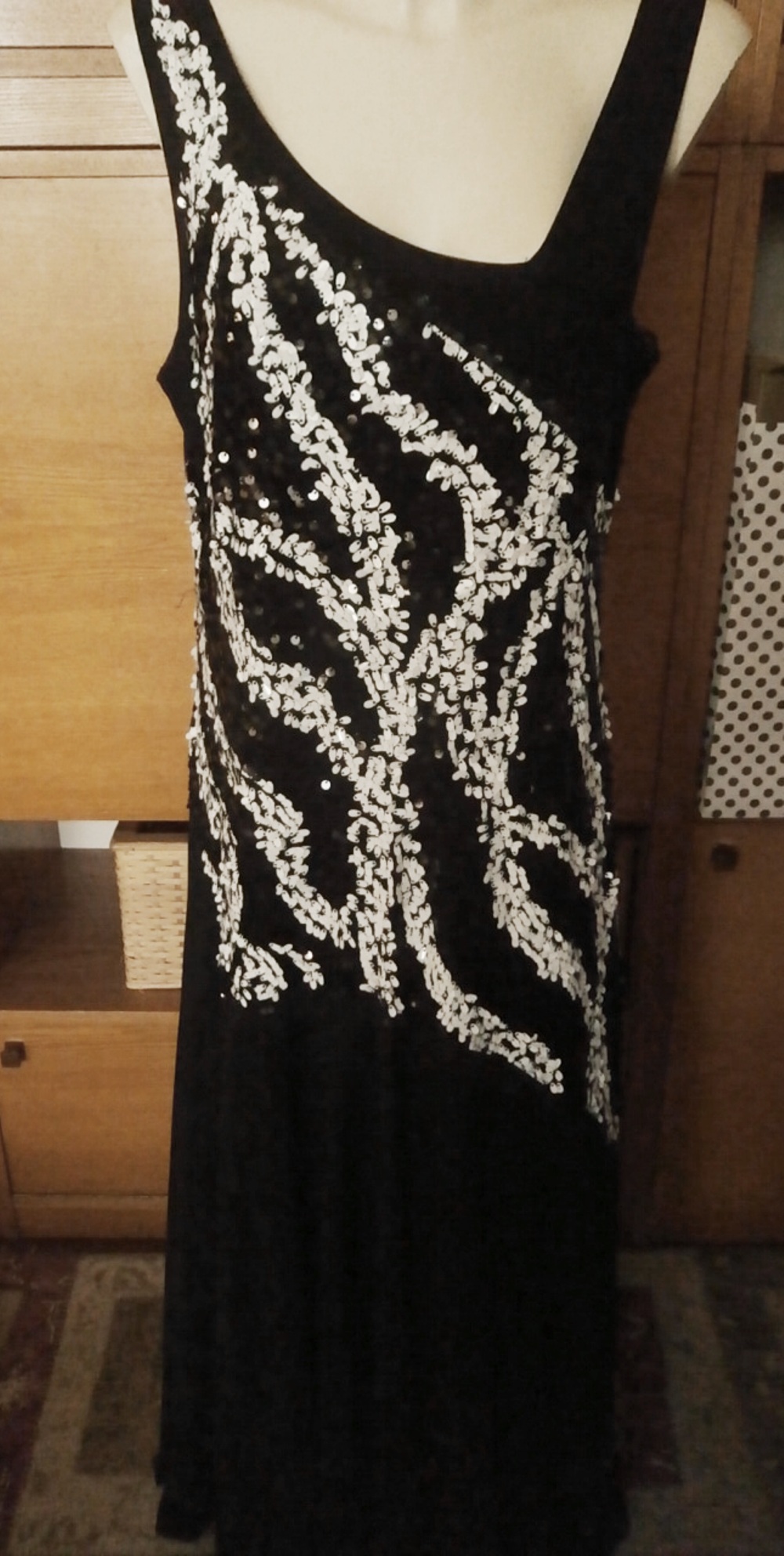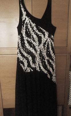 Černé podšité šaty bez rukávů, dolů se rozšiřují, horní část až pod boky má do vzoru našité lesklé stříbřité flitry. Délka 138 cm, šířka mezi průramky -50- cm. Stav je velmi dobrý.