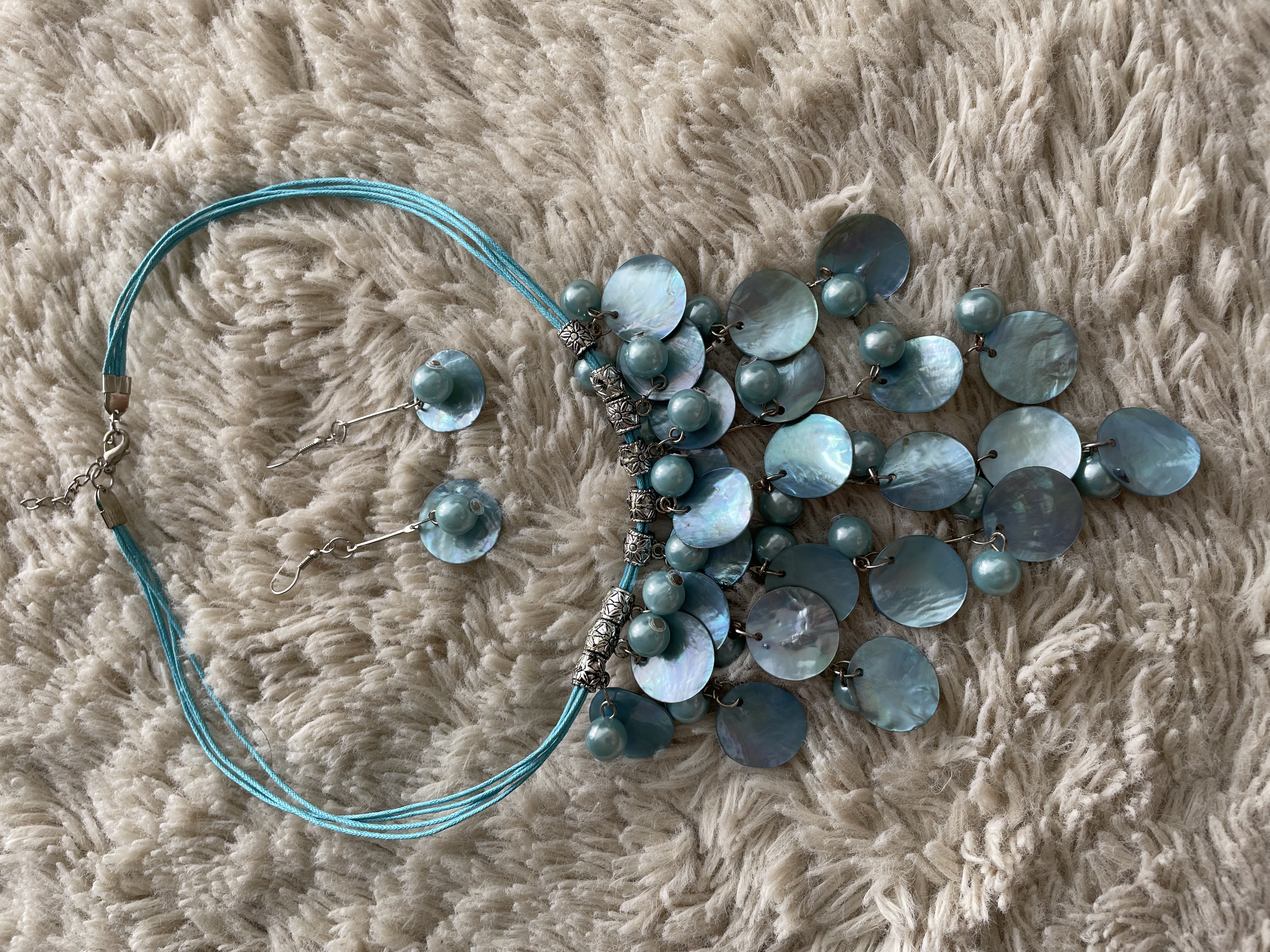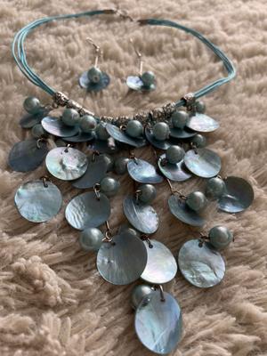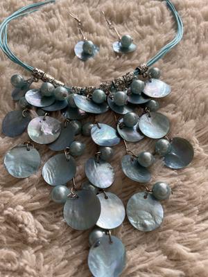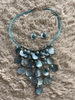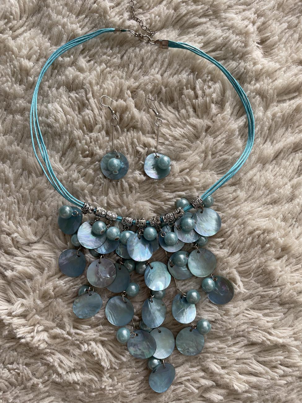 Úplně nový modrý set náhrdelníku a náušnic z mušlí a perel