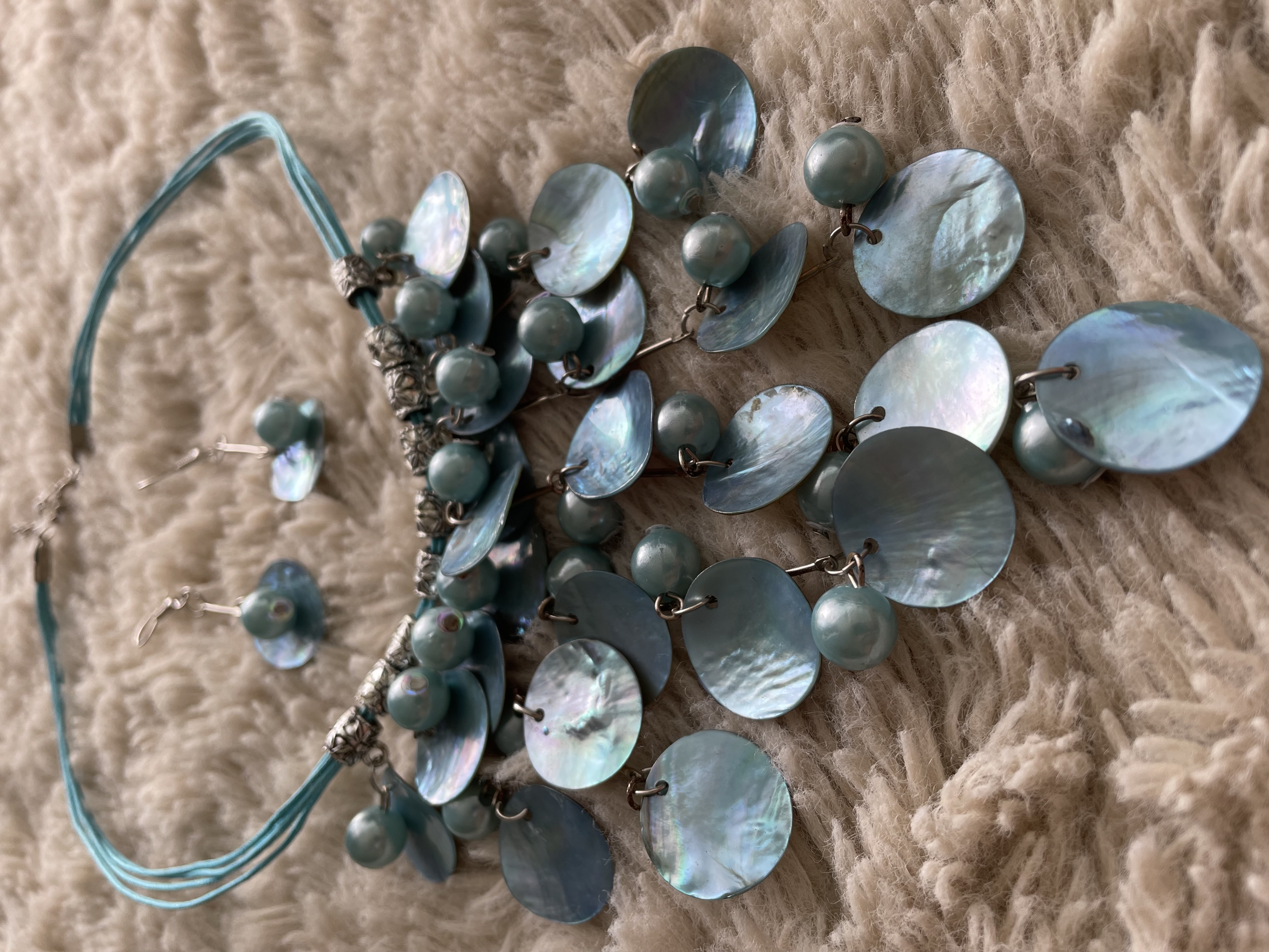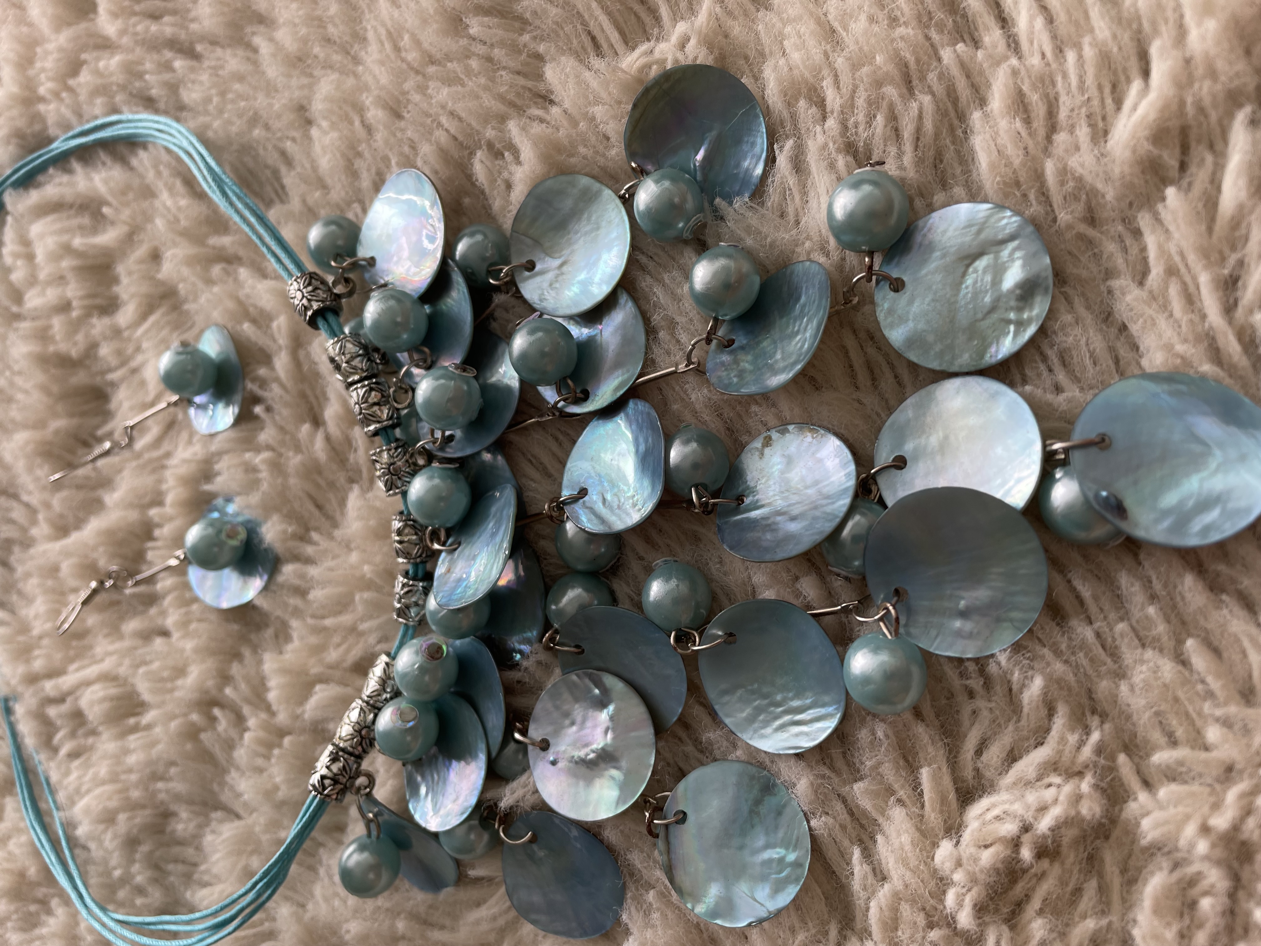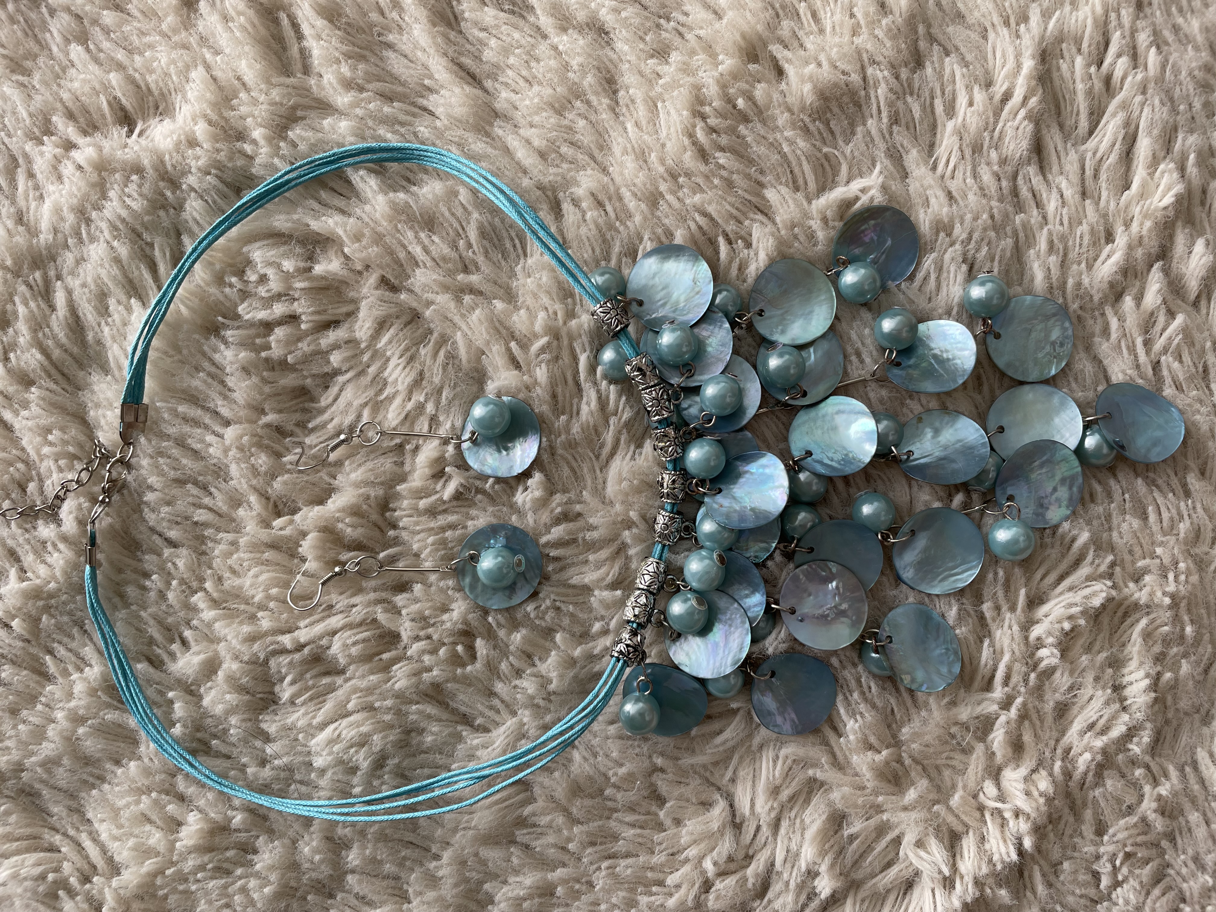 Úplně nový modrý set náhrdelníku a náušnic z mušlí a perel