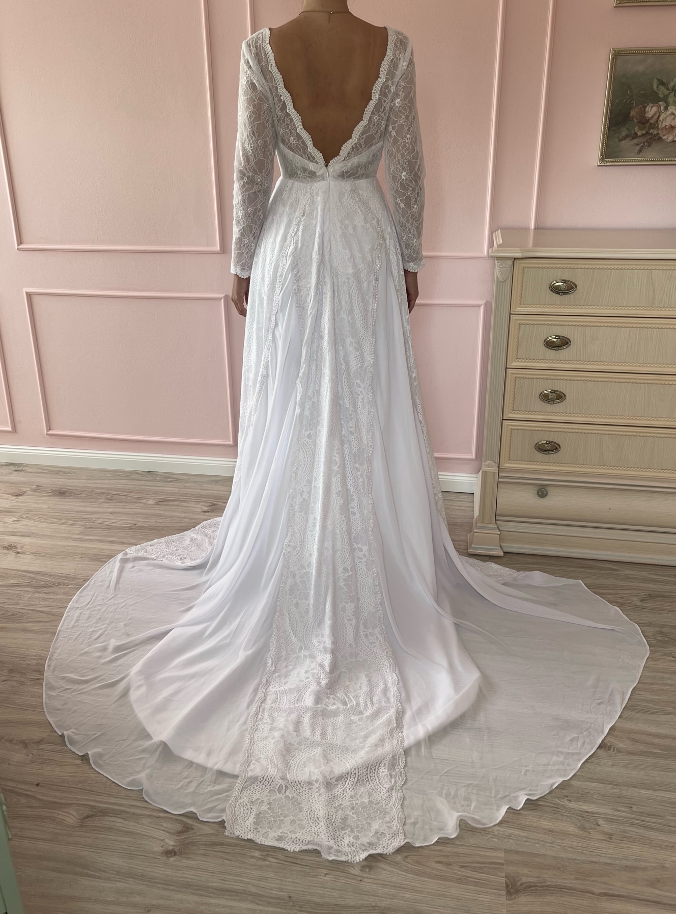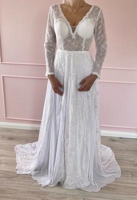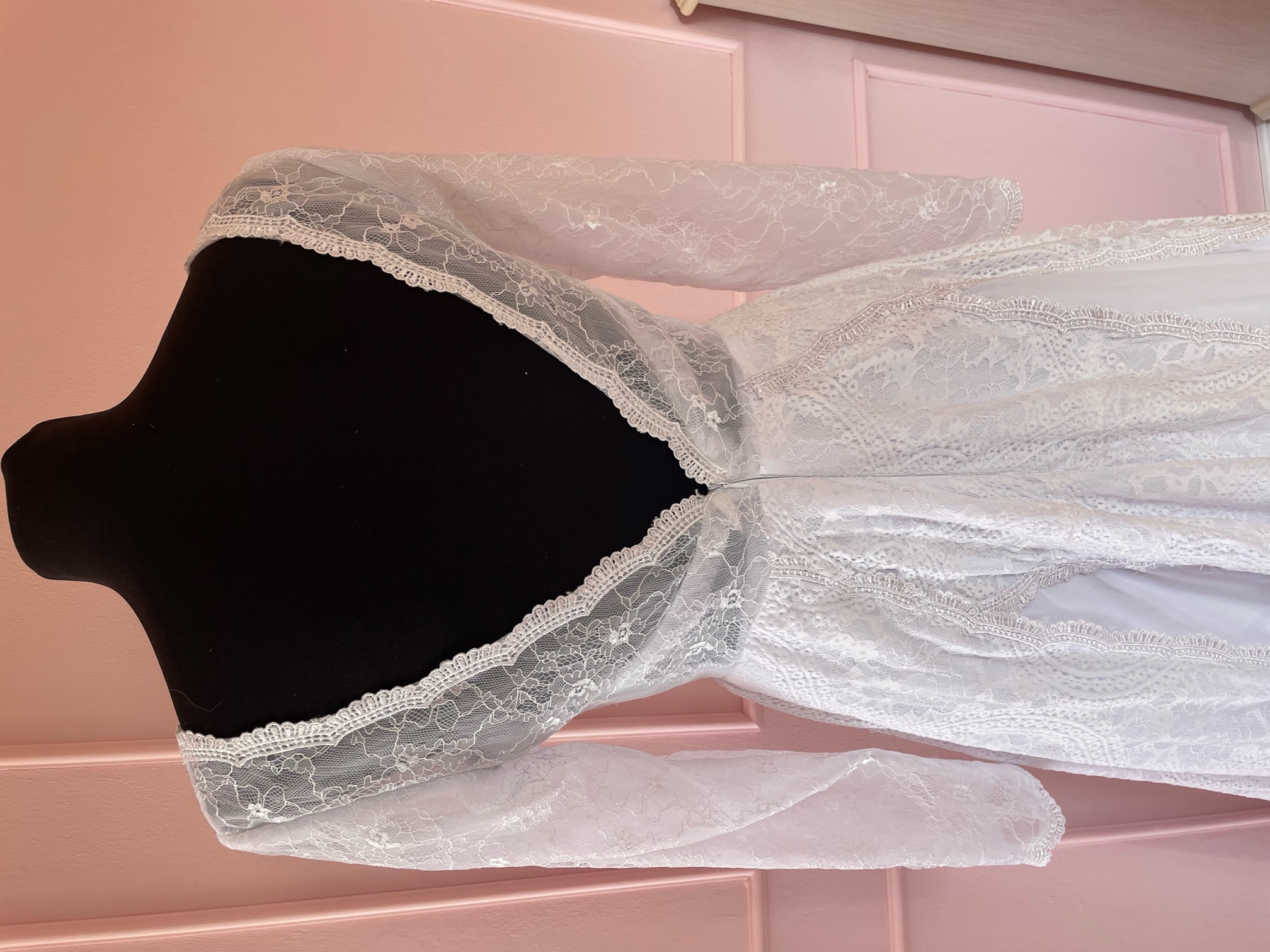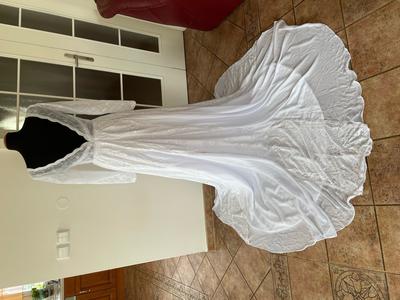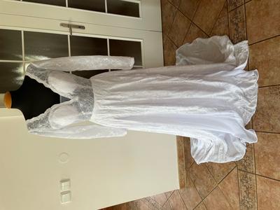 Šaty s jedinečným designem šité na zakázku, nikdy však nebyly nošené.Míry: Prsa 95cm, pod prsy 80 cm, pas 67 cm, boky 95 cm (ale jsou volnější), rukávy délka 58 cm, průměr paže 26 cm na konci rukávu 17 cm, délka šatů 157 cm vhodné i pro vyšší postavy - foceno na výšce 180 cm