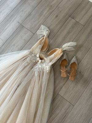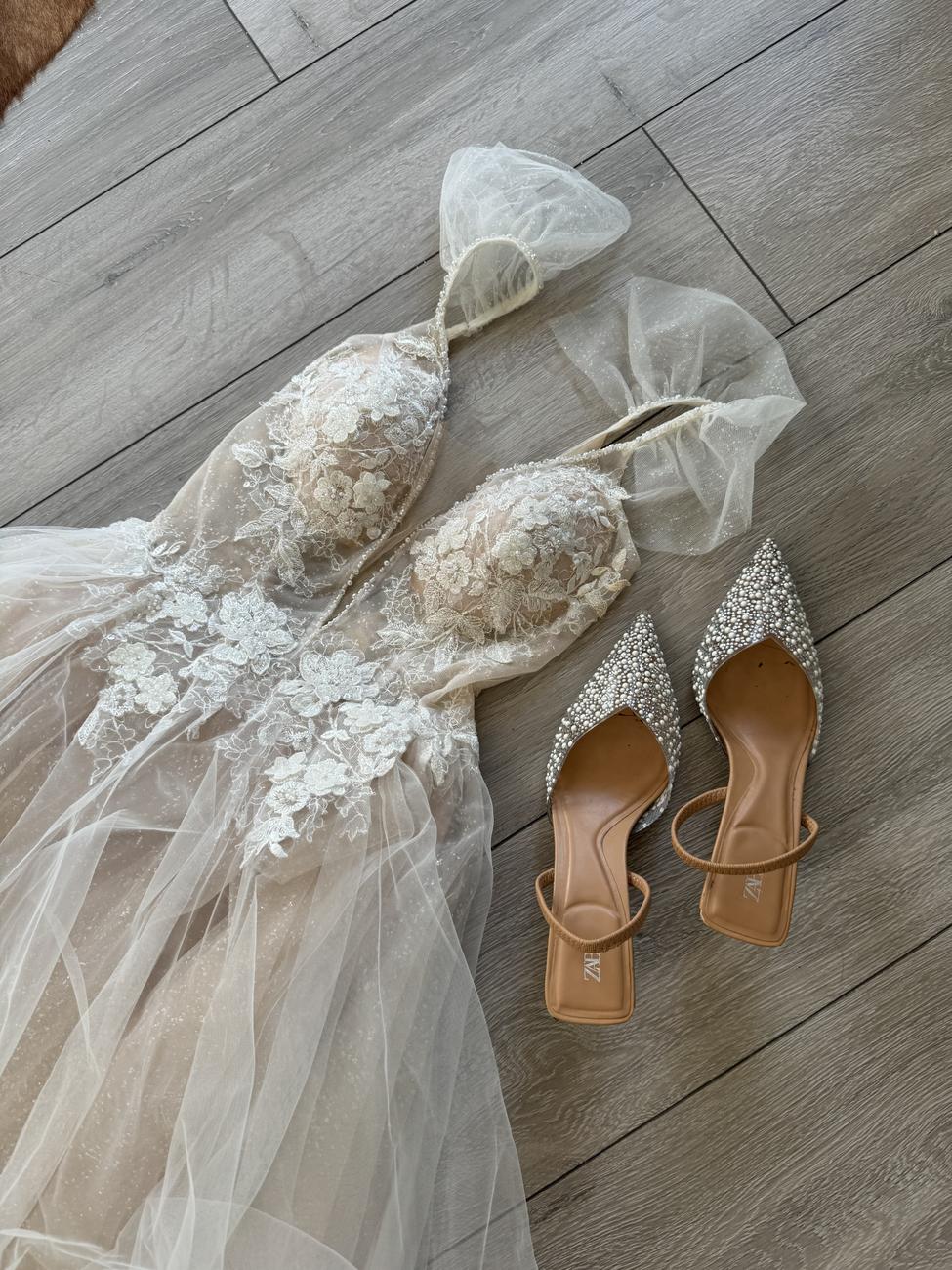 Krásné jemné svatební šaty s všitou sukní. Malinké krajkové rukávky, krajkový vršek poloprůhledný, v délkách sukně jemňounké kamínečky aby odrážely slunce. Šité na míru, PC : vysoká Pro menší slečny kolem 165 cm Bude sedět XS i S