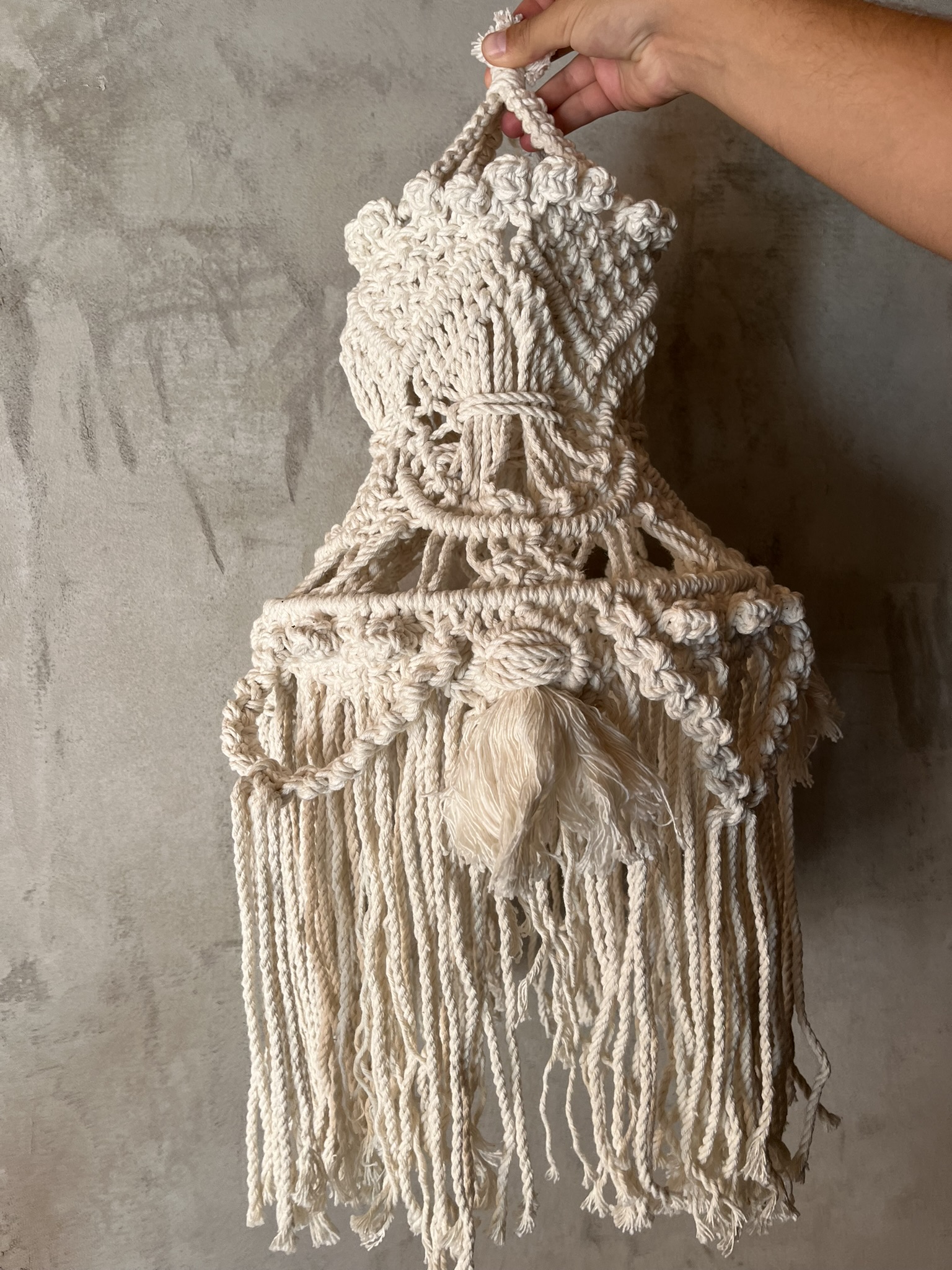 Ručně vyrobený macramé lustr, uzpůsobený na zavěšení a vložení malé žárovky či světýlek. Byl použitý pouze na focení. V případě zakoupení více položek z nabídky je možné se dohodnout na množstevní slevě:)