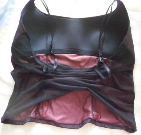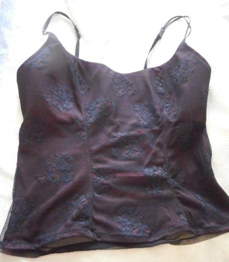 Černá krajková košilka má přední díl vyztužený a podšitý vínovou barvou. Nenošená.